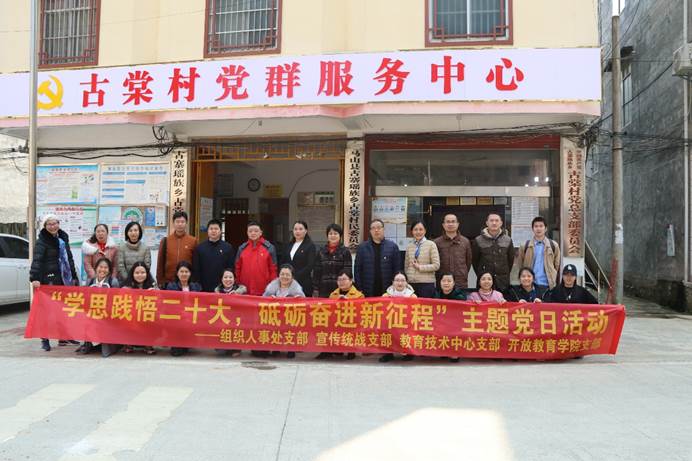 宣传统战支部 卓芍报道 为深入学习宣传贯彻落实党的二十大精神,落实和加强党员教育、党史国情教育、爱国主义教育,助力乡村振兴,推进新时代文明实践走深走实,2023年2月15日,组织人事处支部、宣传统战支部、教育技术中心支部、开放教育学院支部等来到南宁市马山县古寨瑶族乡古棠村,联合开展“学思践悟二十大,砥砺奋进新征程”主题党日活动。