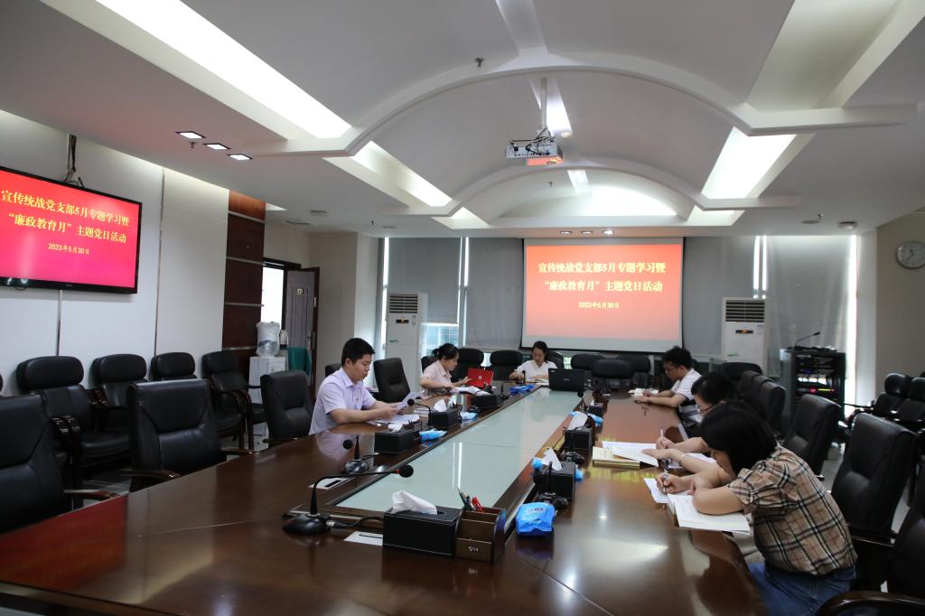 宣传统战党支部 卓芍报道 为深入学习贯彻习近平新时代中国特色社会主义思想和党的二十大精神,强化党员干部教职工的理论武装和党性修养,增强党员干部教职工的纪律意识和廉洁自律意识,2023年5月30日,宣传统战党支部在远教大厦16楼会议室开展5月专题学习暨“廉洁教育月”主题党日活动。活动由支部书记胡峥嵘主持,支部全体党员参加活动。