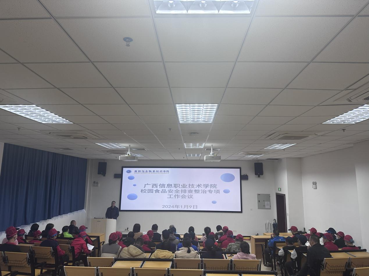 后勤与保卫处 谭彬报道 为进一步贯彻落实全区校园食品安全排查整治专项行动动员部署视频会议精神,进一步加强学校的食品安全管理工作,星空网页版登录入口于1月10日在2号实训楼105教室召开校园食品安全排查整治专项工作会议。广西信息职业技术学院副院长黄河,后勤与保卫处相关人员以及学校食堂工作人员参加了会议。会议由后勤与保卫处处长邓艳主持。