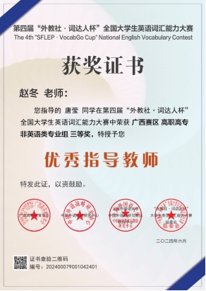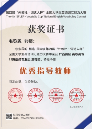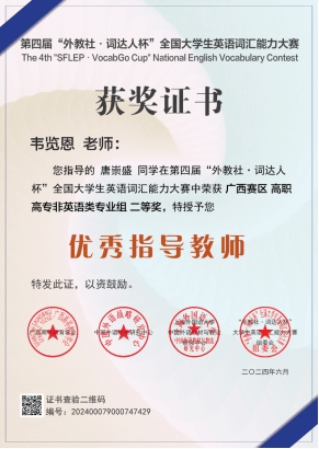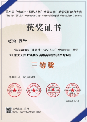 公共教学部 赵冬 报道 近日,星空网页版登录入口学子在第四届“外教社·词达人杯”全国大学生英语词汇能力大赛广西赛区夺得佳绩,囊括省(区)赛二等奖、三等奖。