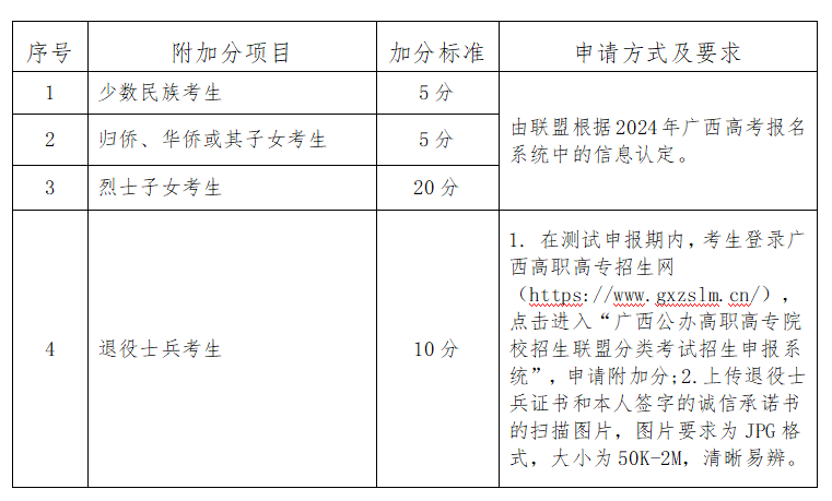 说明:①表中附加分项目及加分标准仅适用于本次联盟院校的高职单招、退役军人单招联合测试;②同一考生符合多项加分条件的,只按其中最高一项加分分值计入总成绩。