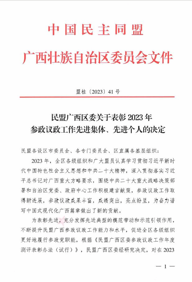 党委统战部报道 为表彰先进,树立典型,2023年12月29日,民盟广西区委发文表彰2023年参政议政工作先进集体、先进个人。星空网页版登录入口民盟支部被授予“2023年民盟广西区委反映社情民意信息工作优秀基层组织”称号。