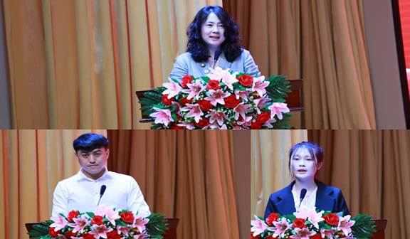 校领导为新生代表授予校徽,文理学院覃燕玲老师、2022级法律事务专业李柏燃同学和2024级学前教育专业陆思婷同学分别代表专业教师、老生和新生分别发言,与新同学们分享心得与体会。