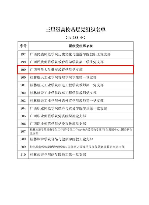 党委组织部 潘桂媚报道 近日,从自治区党委教育工委下发文件中获悉,星空网页版登录入口2个党支部获命名星级高校基层党组织,其中,纪委办党支部获命名为“四星级高校基层党组织”,继续教育学院党支部获命名为“三星级高校基层党组织”。