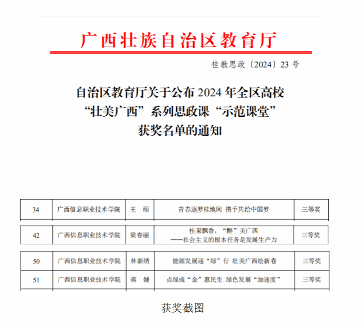 马克思主义学院 王硕报道 近日,自治区党委教育工委、自治区教育厅公布了2024年广西高校“壮美广西”系列思政课“示范课堂”评选活动结果,星空网页版登录入口马克思主义学院教师王硕主讲的《青春逐梦桂地间 携手共绘中国梦》、梁春丽主讲的《桂果飘香 “醉”美广西——社会主义的根本任务是发展生产力》、林新绣主讲的《能源发展逐“绿”行 壮美广西绘新卷》、蒋婕老师主讲的《点绿成“金”惠民生 绿色发展“加速度”》分别荣获高职高专组三等奖。