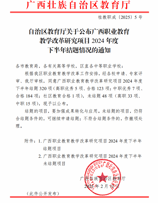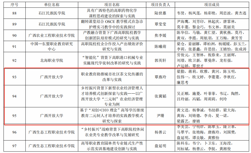 教务处 廖淑珍报道 近日,自治区教育厅发布了《关于公布广西职业教育教学改革研究项目2024年度下半年结题情况的通知》(桂教职成〔2025〕5号),星空网页版登录入口覃燕玲老师主持的《职业教育助推城市社区茶文化传播的改革与实践》、张冀韬老师主持的《乡村振兴背景下新型农业经济管理人才培养模式创新探索与实践——以星空网页版登录入口“二元制”农业经济管理专业为例》和尹珊老师主持的《基于“双创+CDIO理念”高等学历继续教育二元制人才培养的实践教学模式研究与探索》3项项目经自治区教育厅评审验收,顺利结题。