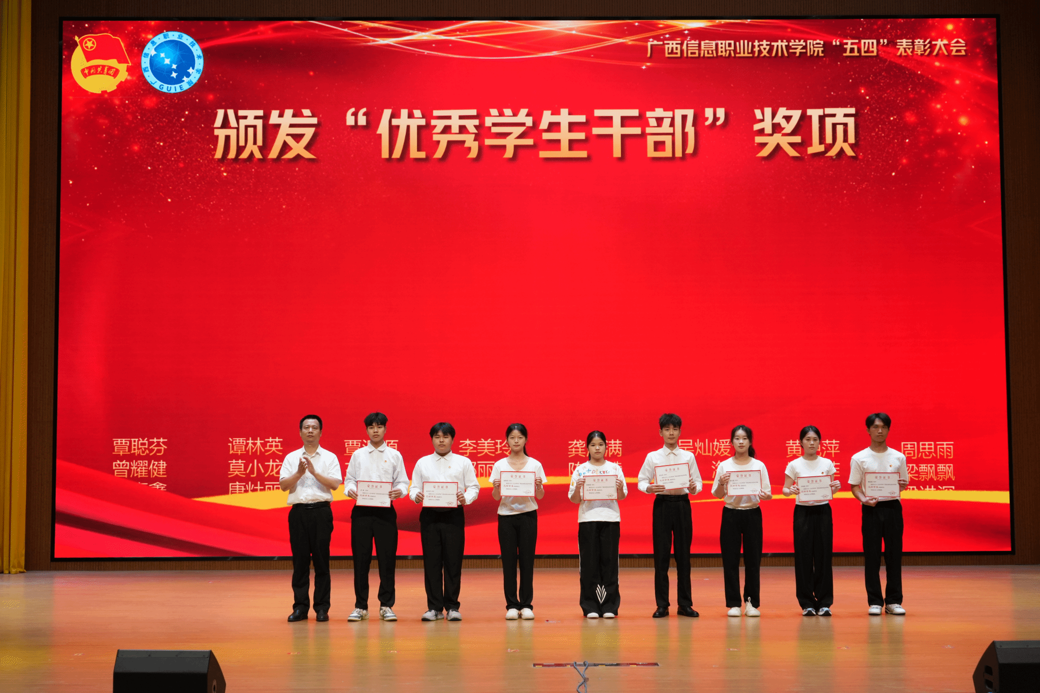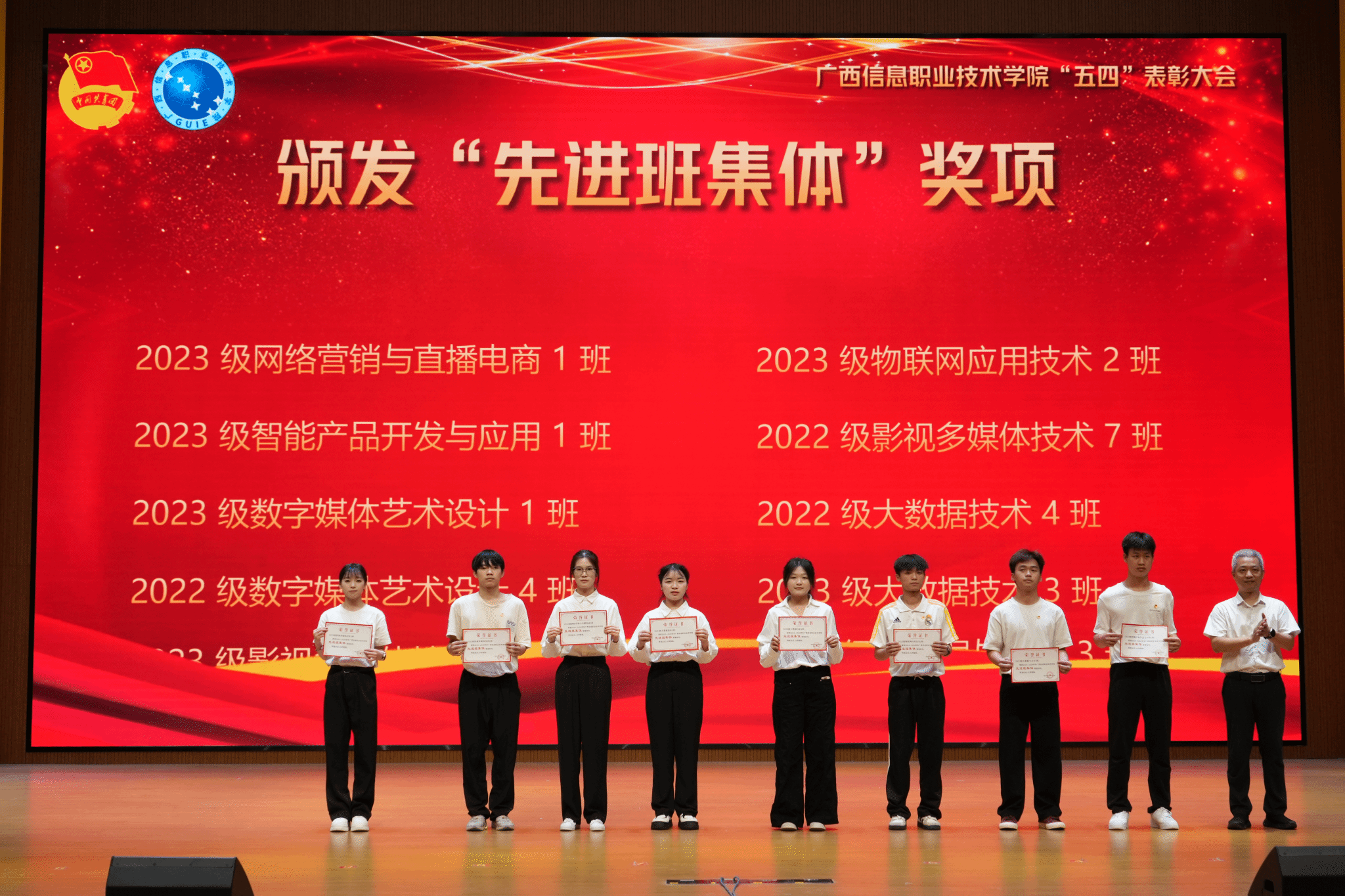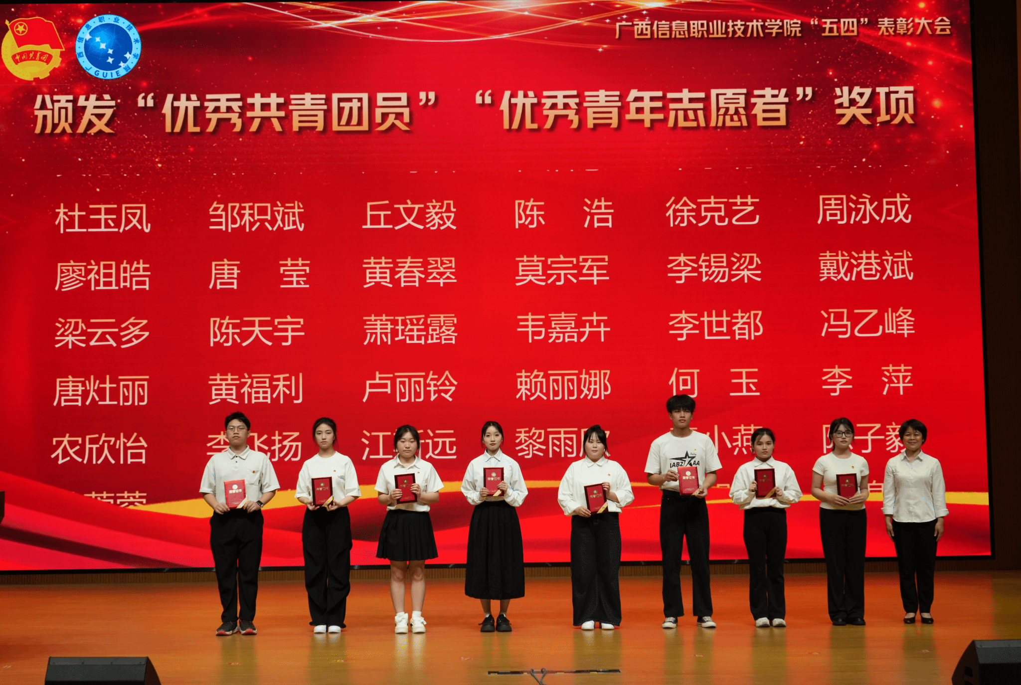 活动现场,龙雪津宣读了《广西信息职业技术学院关于表彰2024-2025学年度“五四”先进集体和先进个人的决定》以及奖学金奖项表彰文件。副院长陈广杰宣读了《广西信息职业技术学院关于表彰2023-2024学年度“先进班集体”“三好学生”“优秀学生干部”的决定》。与会领导分别为五四红旗分团委、五四红旗团支部、优秀共青团干部、优秀青年志愿者、国家励志奖学金、三好学生等先进集体和优秀个人进行颁奖。