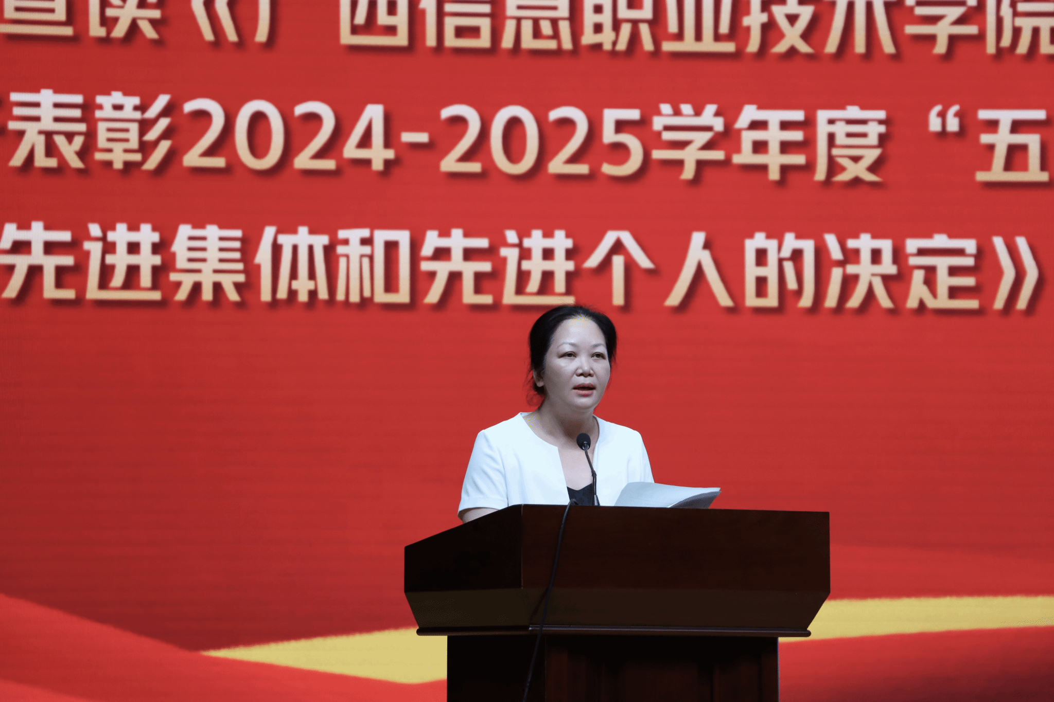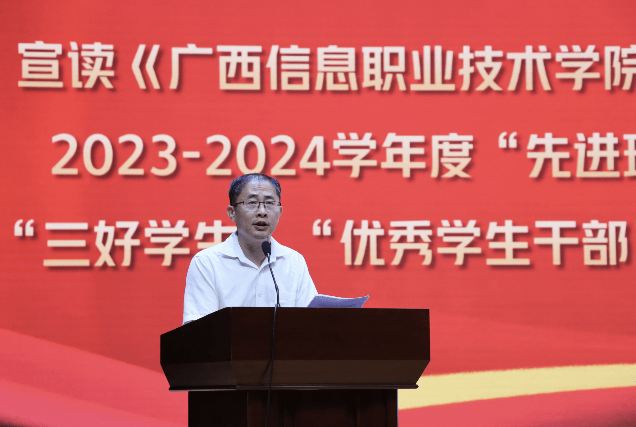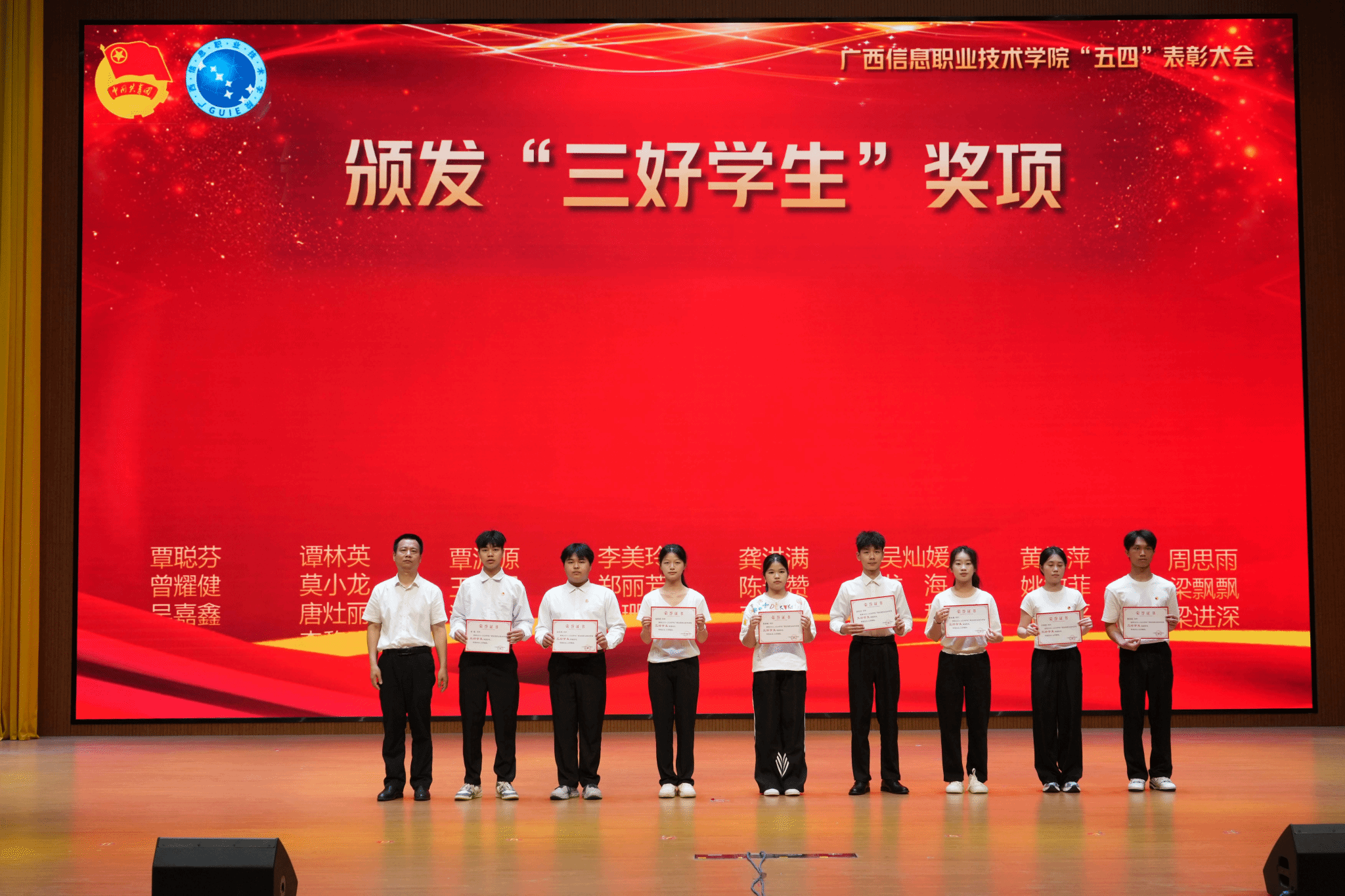 活动现场,龙雪津宣读了《广西信息职业技术学院关于表彰2024-2025学年度“五四”先进集体和先进个人的决定》以及奖学金奖项表彰文件。副院长陈广杰宣读了《广西信息职业技术学院关于表彰2023-2024学年度“先进班集体”“三好学生”“优秀学生干部”的决定》。与会领导分别为五四红旗分团委、五四红旗团支部、优秀共青团干部、优秀青年志愿者、国家励志奖学金、三好学生等先进集体和优秀个人进行颁奖。