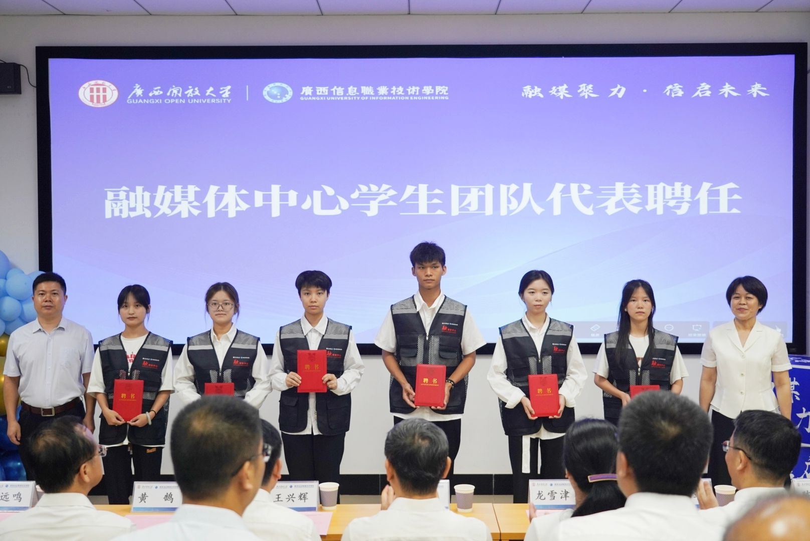 仪式上,广西信息职业技术学院党委副书记陈雪松、学校党委宣传部部长胡峥嵘为融媒体中心学生团队代表颁发证书。数字艺术与传媒学院黄晨鹏作为指导教师代表发言,指出融媒体中心的成立,将为学生们提供真实的媒体环境与项目资源。学生们将在参与新闻采编、视频制作、新媒体运营等全流程工作中,将课堂所学知识转化为实际技能。2024级影视多媒体技术3班李元怡作为学生代表发言,她热切期待融媒体中心成为提升专业能力的重要阶梯,让同学们通过参与校园新闻报道、专题视频制作等实践工作,将课堂所学转化为实际技能,同时积累实战经验,为未来职业发展奠定坚实基础。