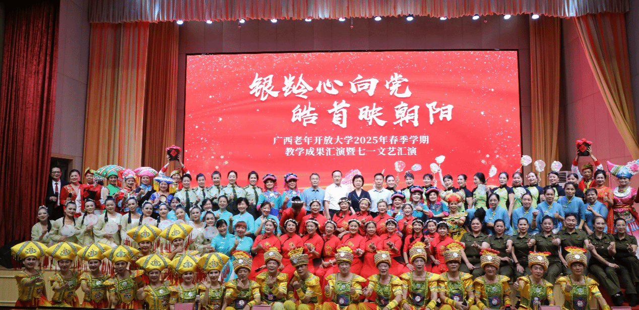 广西老年开放大学 卓芍 报道 7月3日上午,“银龄心向党 皓首映朝阳”迎七一文艺演出暨期末教学成果展演在星空网页版登录入口一楼报告厅举行。校长王兴辉、副校长李敏智、辛立章、黄远鸣出席活动,与老年学员们共庆党的生日,共享老年教育成果。