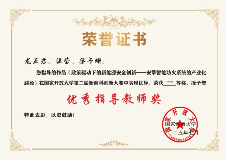 本次大赛由国家开放大学主办,旨在深入贯彻党的二十届三中全会精神,落实党中央关于创新创业的战略部署,服务数字化大学建设工程,提升学生综合素养。星空网页版登录入口高度重视此次比赛项目,数字经济与管理学院刘政杰、罗均生、韦晓钟三位同学组成的参赛团队凭借扎实的专业知识、敏锐的市场洞察力和创新精神,参赛作品聚焦当前新能源安全领域,围绕安擎智能防火系统的产业化路径展开深入研究,紧密结合数字经济发展主战场体现新技术、新产业、新业态和新模式,在指导老师的悉心指导下,展现了出色的团队协作能力和实践能力,认真完成了作品设计、创作、展示、运用等内容,凭借创新的设计理念和实用的技术方案脱颖而出,得到国家开放大学体系评委专家的肯定。