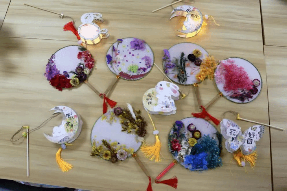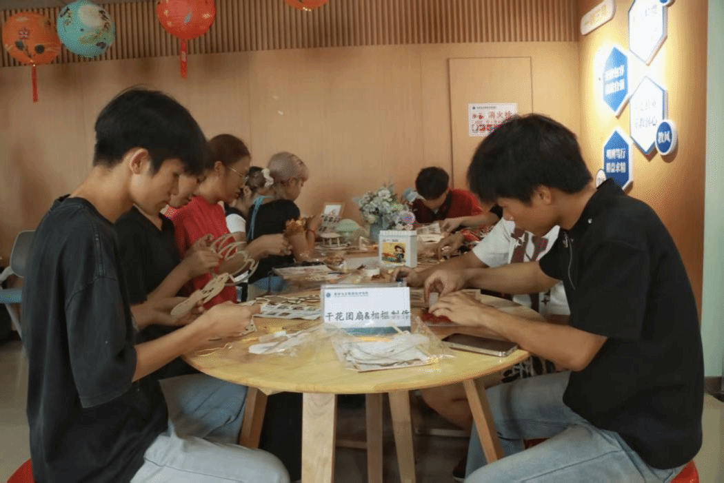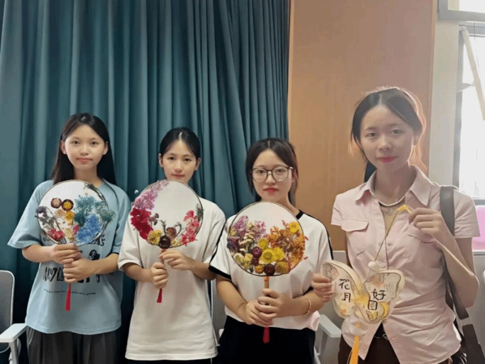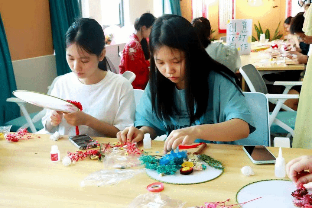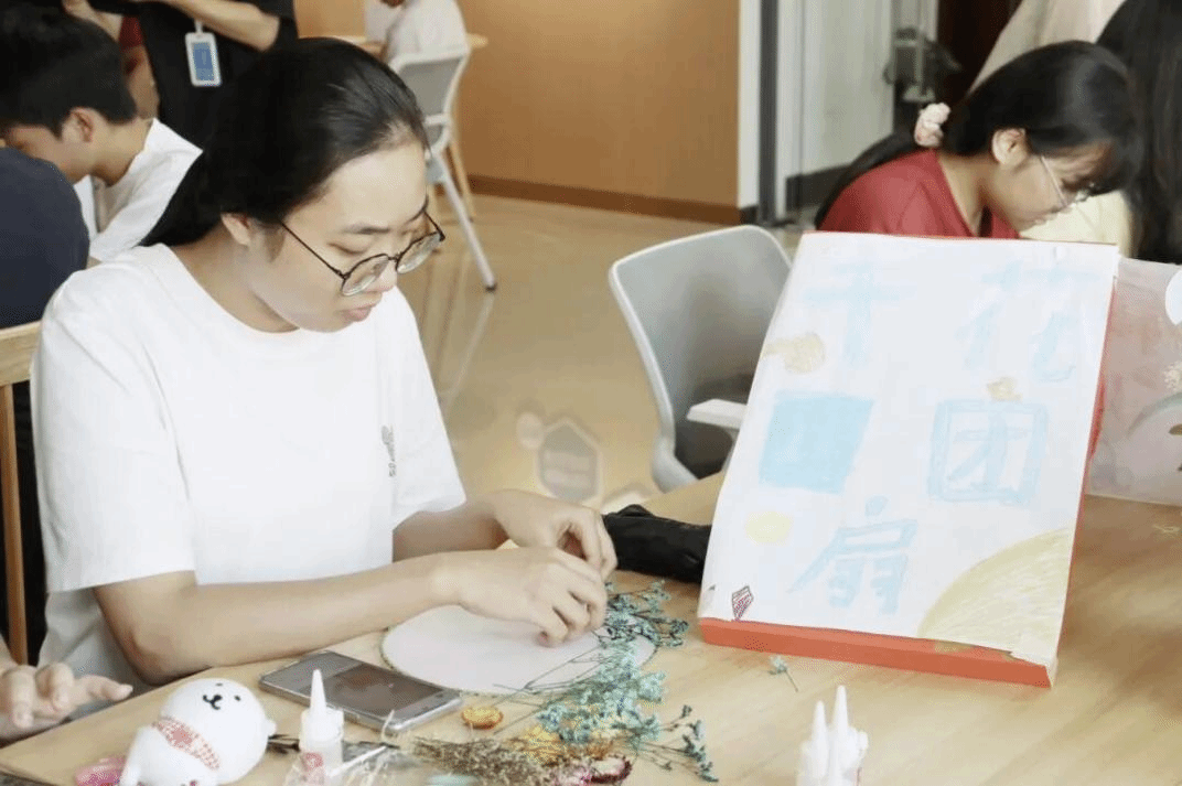在干花团扇区,同学们精心挑选形态各异的干花,结合现代审美构思布局,灵巧的双手将干枯花叶点缀于古典扇面之上,让传统扇艺在干花的映衬下焕发出清新雅致的新韵。