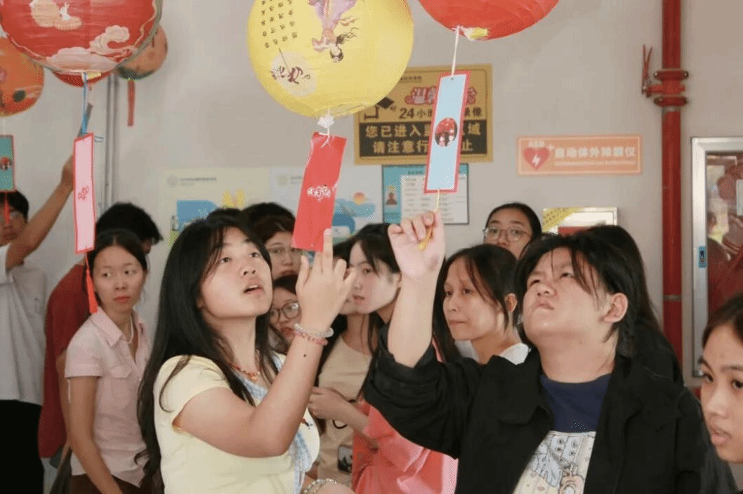 游园会场内,灯谜区前人头攒动,同学们驻足凝神,在谜面与谜底的推敲间流转智慧,于文字趣味中感受传统魅力。