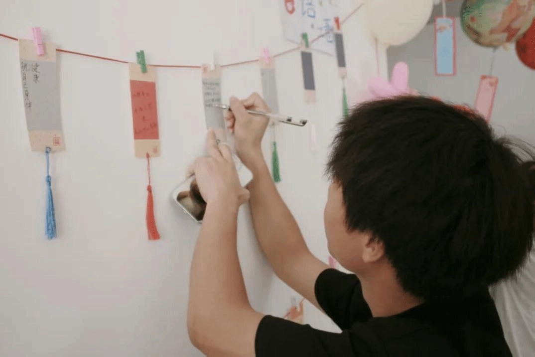 另一隅,同学们正俯首案前,一方彩笺,一笔一画,书写着思念与祝福。字句虽简,情意绵长,既寄托对远方的牵挂,也承载对未来的憧憬。