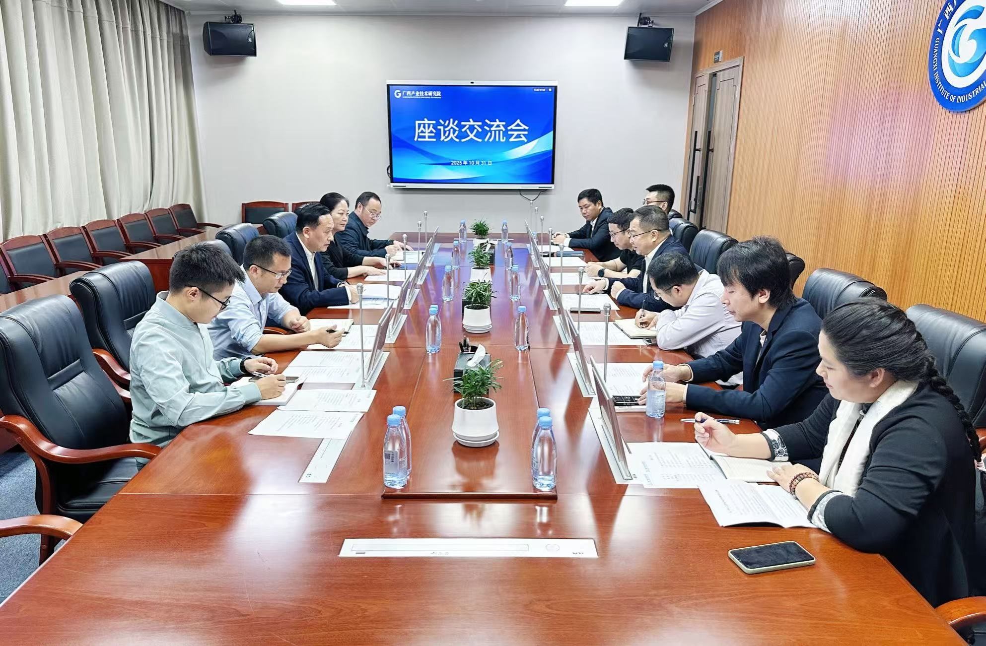 座谈交流环节,广西产业技术研究院各研究所负责人围绕数字虚拟技术、人工智能、数字人研发、智能制造等重点领域,详细介绍了各自的技术成果、核心优势及中长期发展规划。王兴辉结合学校办学定位、专业建设特色,阐述了产教融合的发展方向。他表示,学校将以此次交流为契机,与广西产业技术研究院及下属研究所建立长期稳定的深度合作关系,在人才联合培养、学生实习就业、技术协同研发等方面实现资源共享、互利共赢。会上,双方还就共建产业学院议题展开研讨,一致表示将全力推动产业学院尽快落地见效。