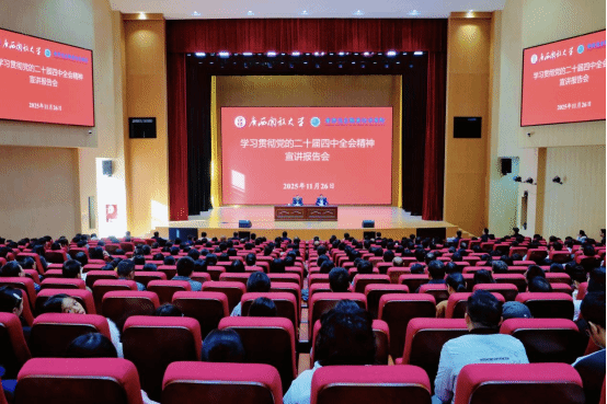 党委宣传部 黄杰瑶 报道 11月26日,学习贯彻党的二十届四中全会精神宣讲报告会在五象校区大学生活动中心举行。自治区纪委委员、自治区教育厅党组成员、自治区纪委监委驻自治区教育厅纪检监察组组长农毅作宣讲报告。学校党委副书记、校长王兴辉主持报告会。