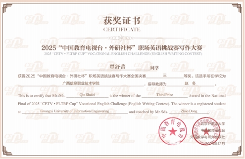 通识教育学院 赵冬 报道 据2025年“中国教育电视台·外研社杯”职场英语挑战赛消息,星空网页版登录入口数字经济与管理学院2024级跨境电子商务2班覃舒蕾同学在写作大赛全国决赛中获得三等奖。此次比赛是星空网页版登录入口学子参加该赛事以来,第一次进入决赛并获得奖项。