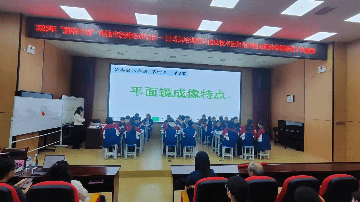 11月至12月,帮扶送教环节聚焦河池市巴马、凤山两县乡村学校,将集中研修的理论成果转化为可落地的教学实践。送教团队秉持“AI赋能、素养导向、本土融合”核心理念,为乡村师生带来了一场场别开生面的“教学革命”。黄玲玲、刘美妮、杨荔诗等教师先后呈现多学科创新示范课,通过平板教学、AI辅助等手段,实现信息技术与乡土教学场景的深度融合。在黄玲玲老师的物理课上,平板设备实时展示平面镜成像实验数据,让抽象的物理原理变得直观易懂。
