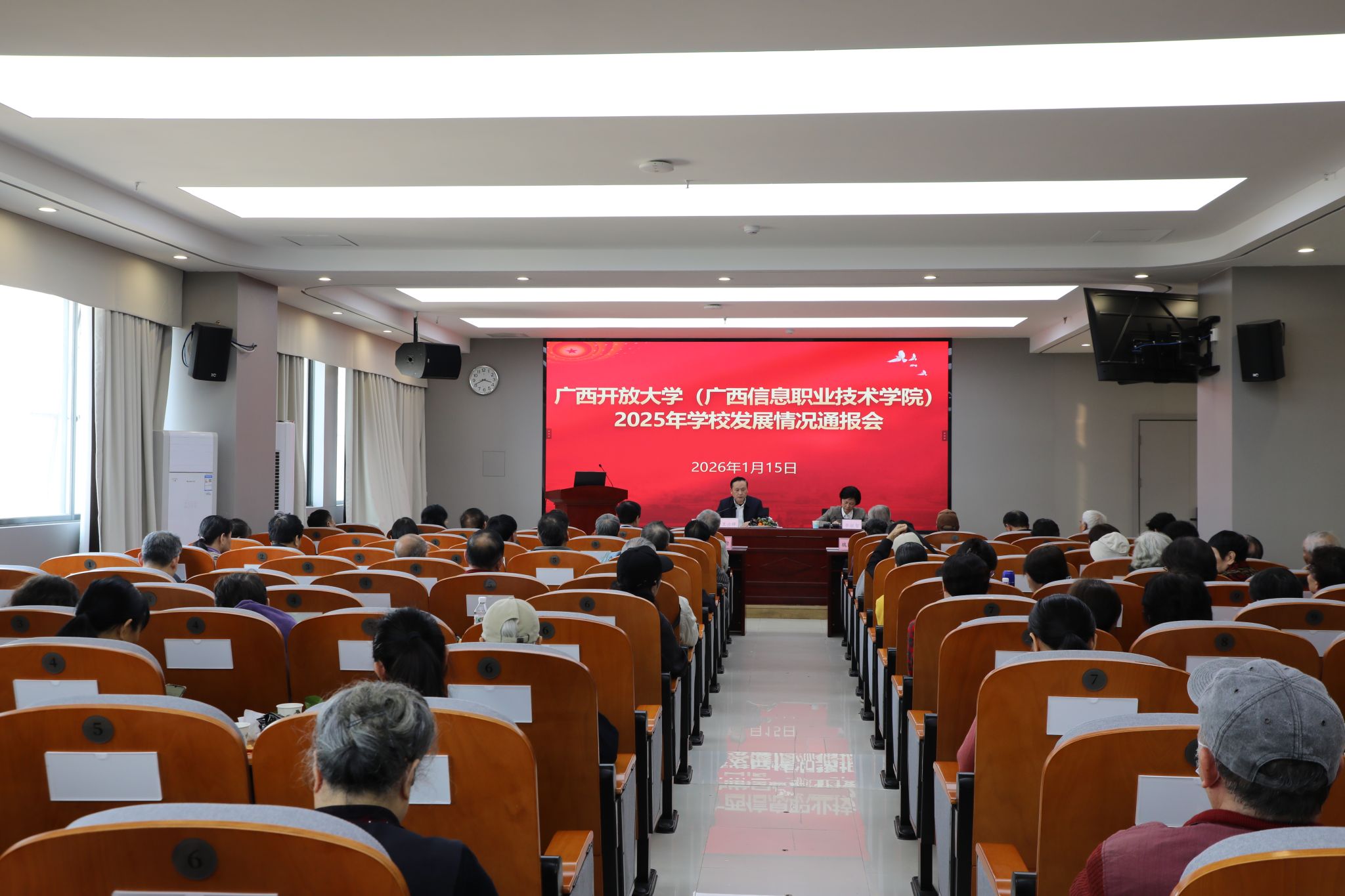 王兴辉向离退休教职工通报了2025年开放大学的内涵建设成果,广西信息职业技术学院的发展以及学校各项服务保障工作情况。最后向老领导、老同志表达了美好的祝愿。