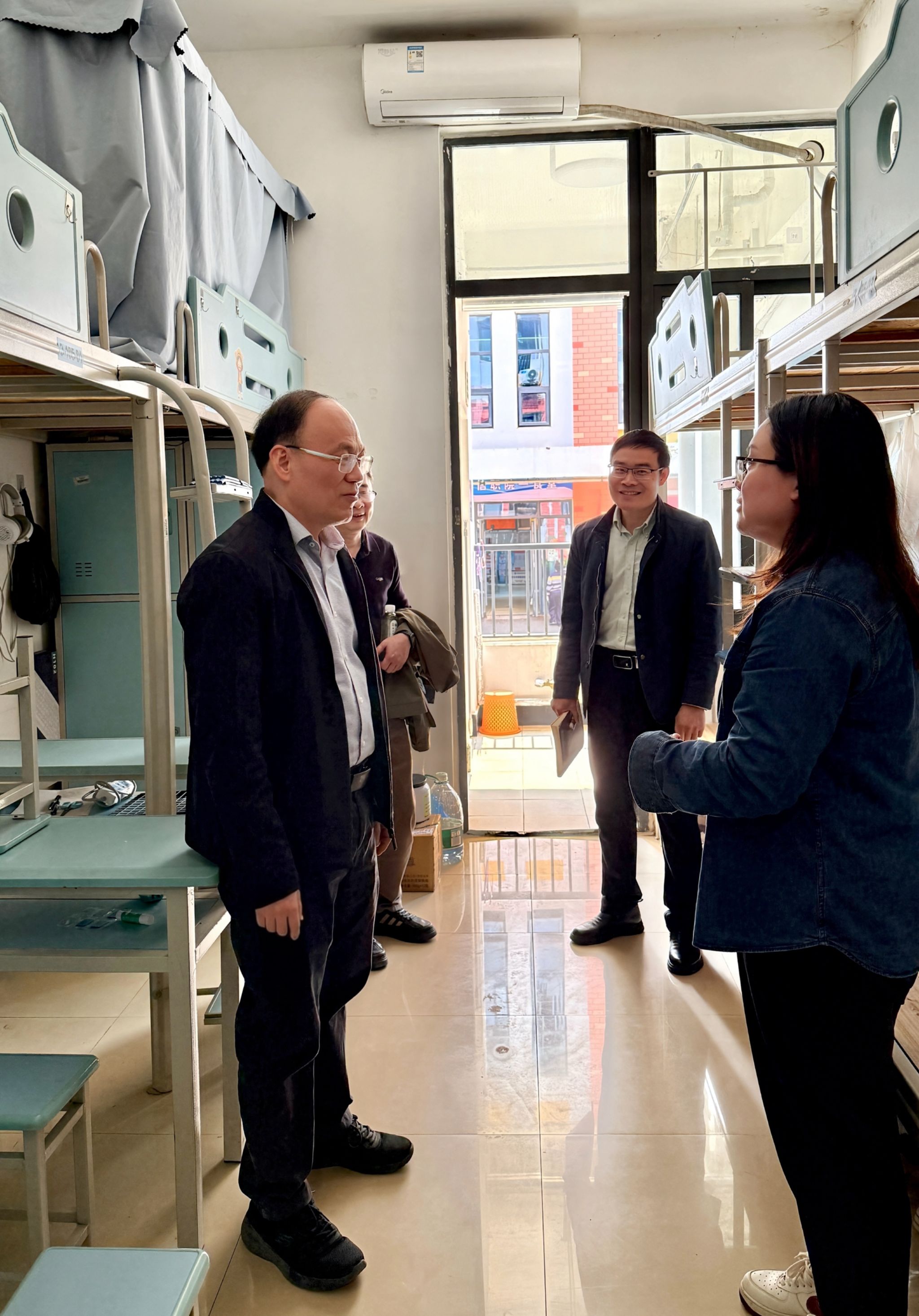 邹勇先后深入各二级学院和大学生活动中心、图书馆、学生宿舍、食堂、消防控制室等重点场所,围绕食品安全、住宿安全、施工安全、消防安全、实训室安全及教学准备等重点工作,现场听取相关负责人汇报,深入了解工作推进中的难点问题,对排查发现的薄弱环节和潜在风险隐患逐一梳理、现场交办,有针对性地提出工作要求与整改意见,确保新学期各项开学准备工作落细落实。
