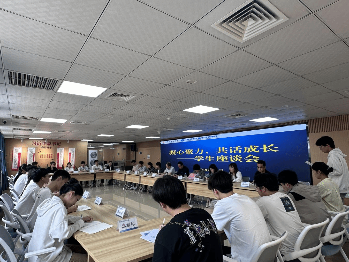 王兴辉强调,全校上下要牢固树立以学生为中心的理念,各职能部门要主动查摆问题、优化服务,切实保障学生学习生活。全体学生要珍惜在校时光,勤学自律、积极向上,班级骨干发挥带头作用,主动向团组织、党组织靠拢,传播青春正能量。全校要推动教育教学与信息技术、人工智能深度融合,引导学生拓宽视野、提升素养,努力成长为心系学校、让学校骄傲的优秀人才。