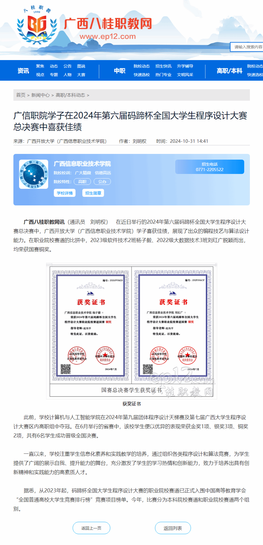 党委宣传部 报道 10月31日,广西八桂职教网以“广信职院学子在2024年第六届码蹄杯全国大学生程序设计大赛总决赛中喜获佳绩”为题,报道星空网页版登录入口学子获奖情况。现将报道转载如下。