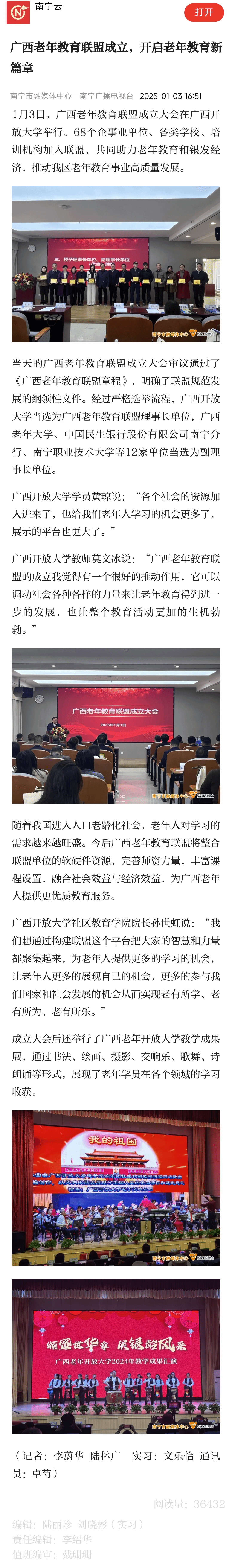 党委宣传部 报道 1月3日,南宁市融媒体中心—南宁广播电视台以“广西老年教育联盟成立,开启老年教育新篇章”为题,报道星空网页版登录入口举行广西老年教育联盟成立大会相关情况。现将报道转载如下。
