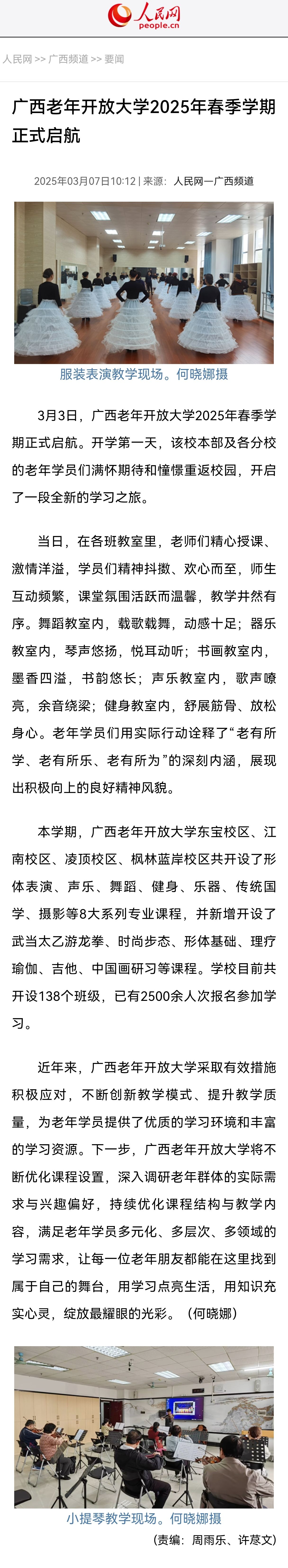 3月3日,人民网-广西频道以“广西老年开放大学2025年春季学期正式启航”为题报道广西老年开放大学新学期开学相关情况。现将报道转载如下。