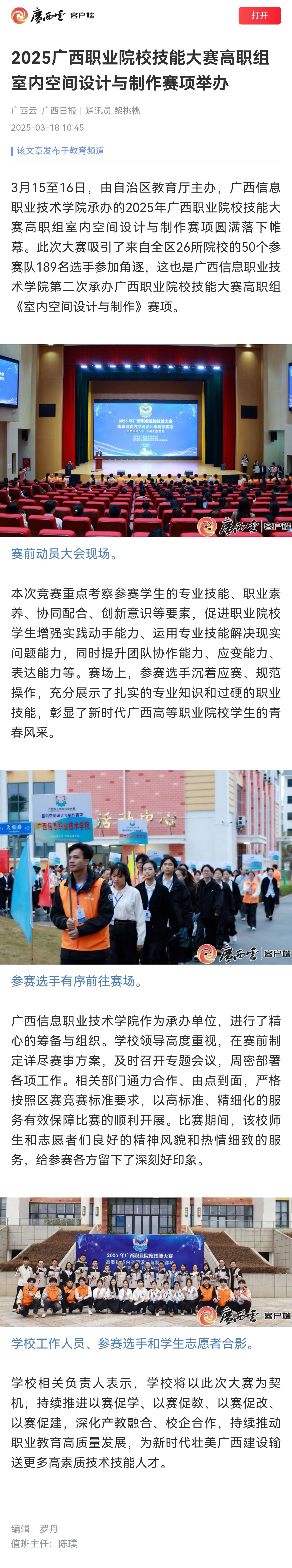 3月18日,广西云-广西日报以“2025广西职业院校技能大赛高职组室内空间设计与制作赛项举办”为题,报道星空网页版登录入口承办比赛相关情况。现将报道转载如下。