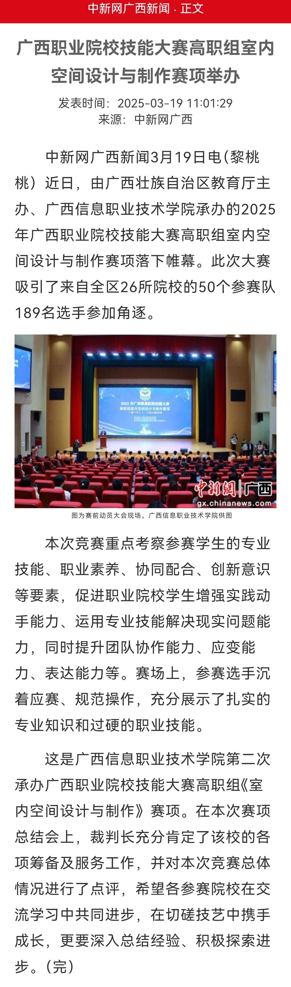 3月19日,中国新闻网以“广西职业院校技能大赛高职组室内空间设计与制作赛项举办”为题,报道星空网页版登录入口承办比赛相关情况。现将报道转载如下。