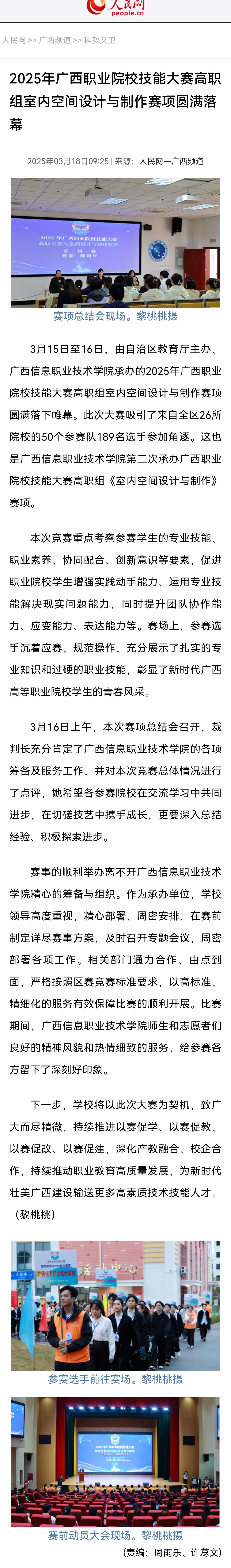 3月18日,人民网-广西频道以“2025年广西职业院校技能大赛高职组室内空间设计与制作赛项圆满落幕”为题,报道星空网页版登录入口承办比赛相关情况。现将报道转载如下。