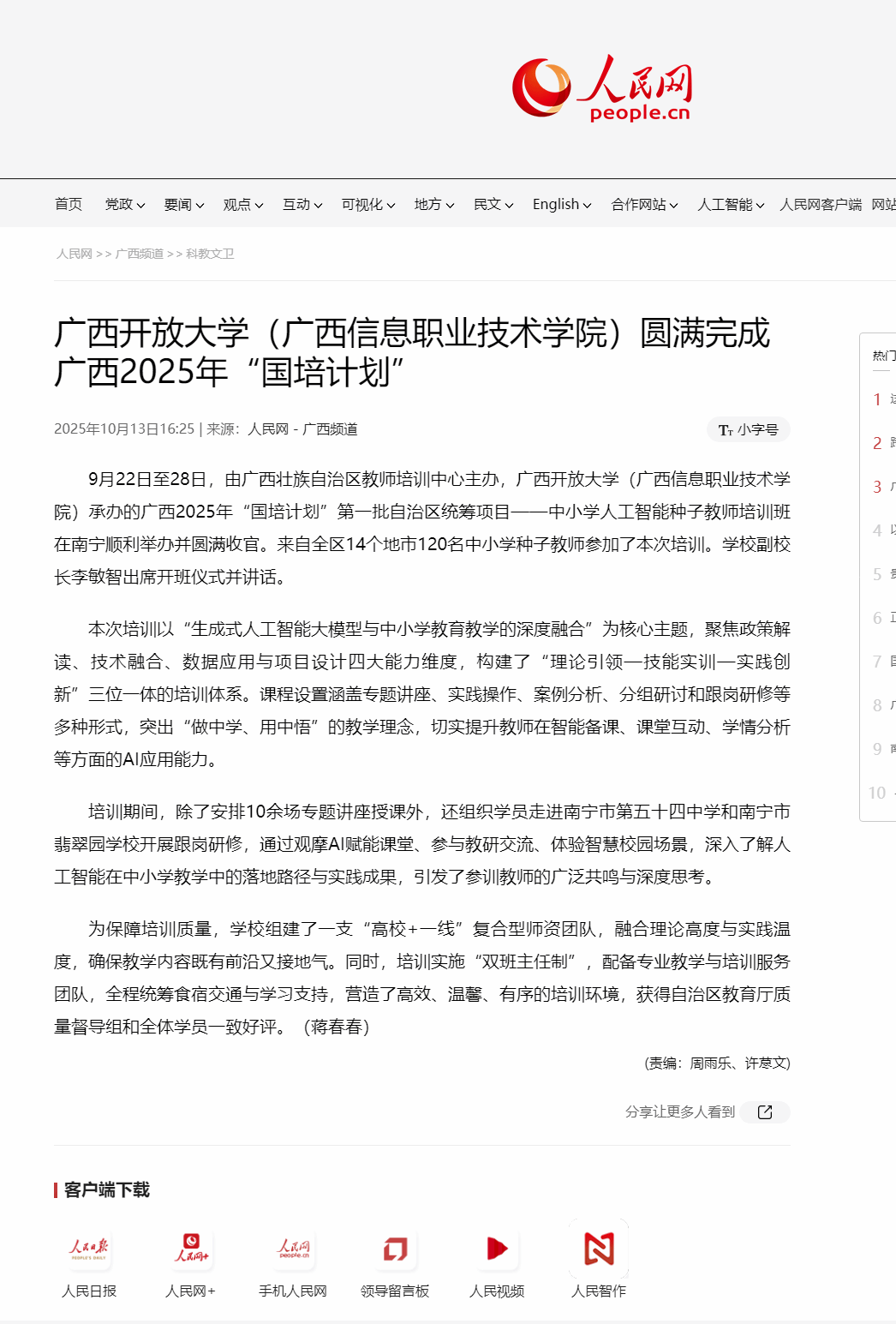 10月13日,人民网-广西频道以“星空网页版登录入口(广西信息职业技术学院)圆满完成广西2025年“国培计划”为题,报道了由广西壮族自治区教师培训中心主办,星空网页版登录入口(广西信息职业技术学院)承办的广西2025年“国培计划”第一批自治区统筹项目——中小学人工智能种子教师培训班在南宁顺利举办并圆满收官的相关情况。现将报道转载如下。
