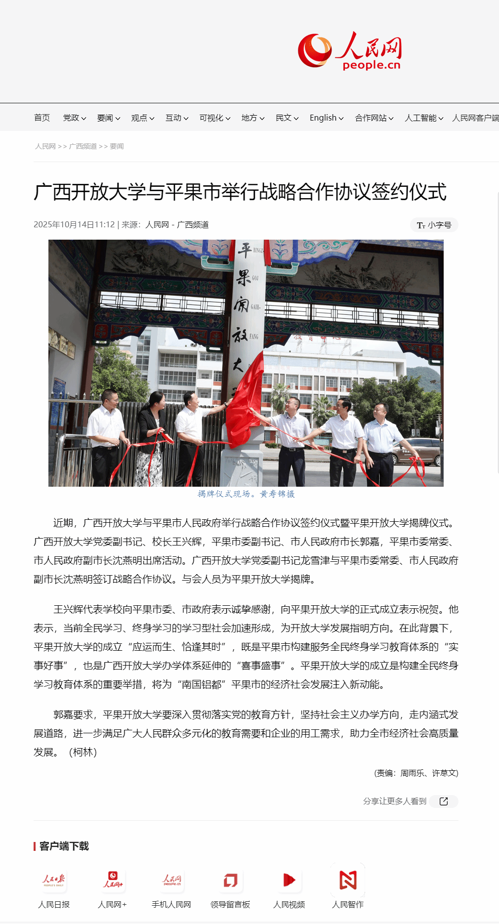10月14日,人民网-广西频道以“星空网页版登录入口与平果市举行战略合作协议签约仪式”为题,报道了星空网页版登录入口与平果市人民政府举行战略合作协议签约仪式暨平果开放大学揭牌仪式的相关情况。现将报道转载如下。
