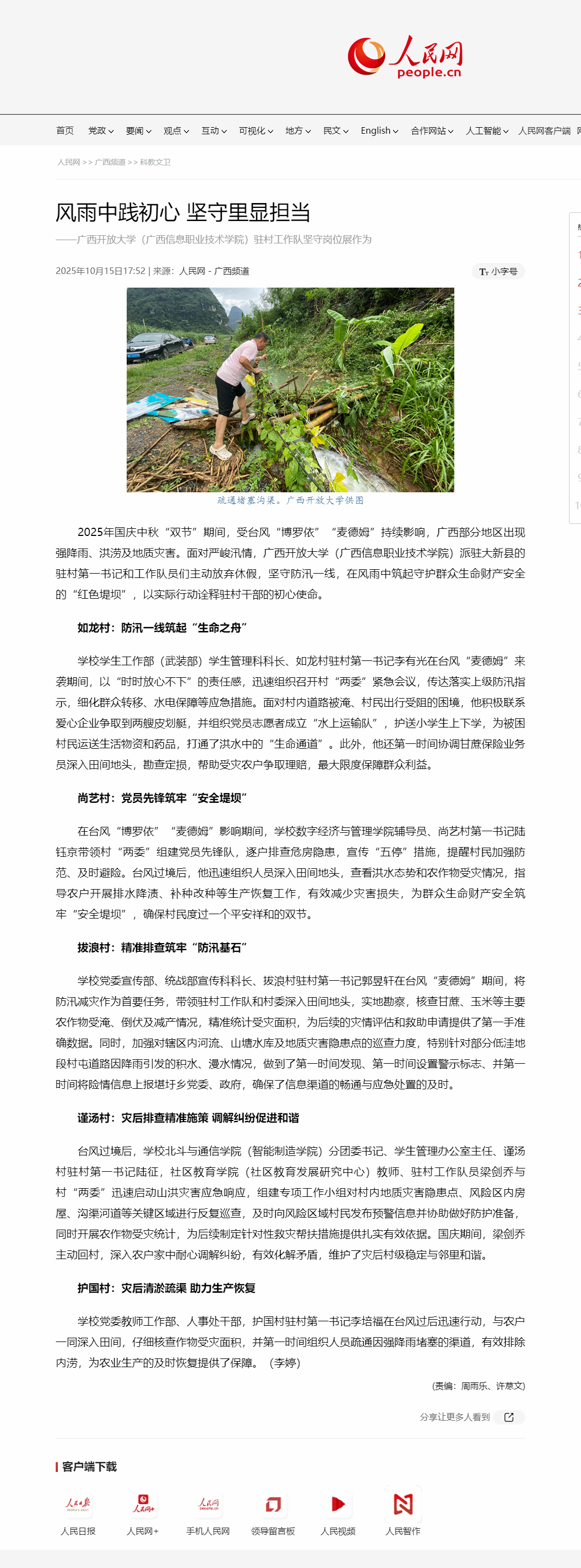 10月15日,人民网-广西频道以“风雨中践初心 坚守里显担当——星空网页版登录入口(广西信息职业技术学院)驻村工作队坚守岗位展作为”为题,报道了面对2025年国庆中秋“双节”期间,台风“博罗依”“麦德姆”造成强降雨、洪涝及地质灾害等严峻汛情,星空网页版登录入口(广西信息职业技术学院)派驻大新县的驻村第一书记和工作队员们主动放弃休假,坚守防汛一线,在风雨中筑起守护群众生命财产安全的“红色堤坝”,以实际行动诠释驻村干部初心使命的相关情况。现将报道转载如下。