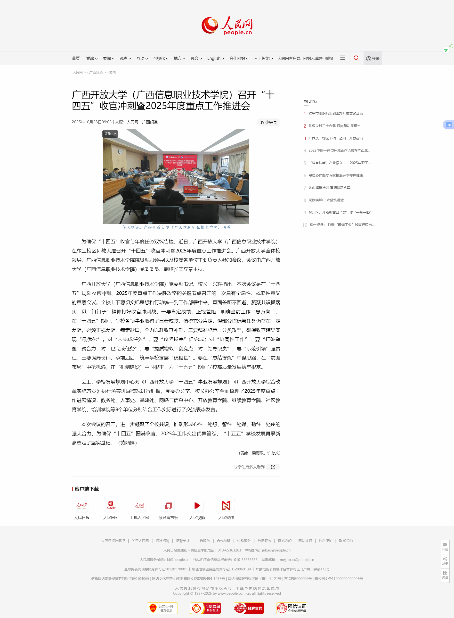 10月24日,人民网-广西频道以“星空网页版登录入口(广西信息职业技术学院)召开“十四五”收官冲刺暨2025年度重点工作推进会”为题,报道了星空网页版登录入口(广西信息职业技术学院)在“十四五”规划收官冲刺、2025年度重点工作决胜攻坚的关键节点召开“十四五”收官冲刺暨2025年度重点工作推进会的相关情况。现将报道转载如下。