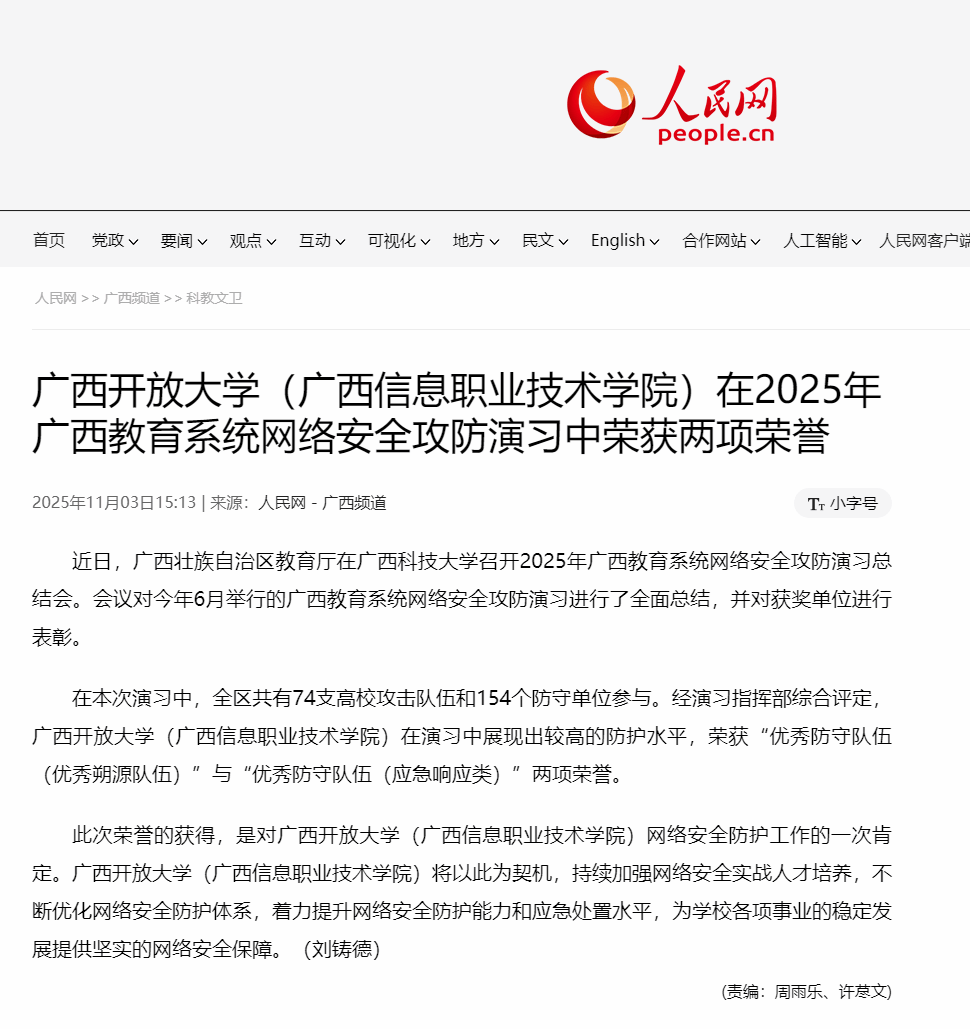 11月3日,人民网-广西频道以“星空网页版登录入口(广西信息职业技术学院)在2025年广西教育系统网络安全攻防演习中荣获两项荣誉”为题,报道了在自治区教育厅召开的2025年广西教育系统网络安全攻防演习总结会上,星空网页版登录入口在今年6月举行的广西教育系统网络安全攻防演习中展现出较高的防护水平,荣获“优秀防守队伍(优秀朔源队伍)”与“优秀防守队伍(应急响应类)”两项荣誉并被表彰的相关情况。现将报道转载如下。