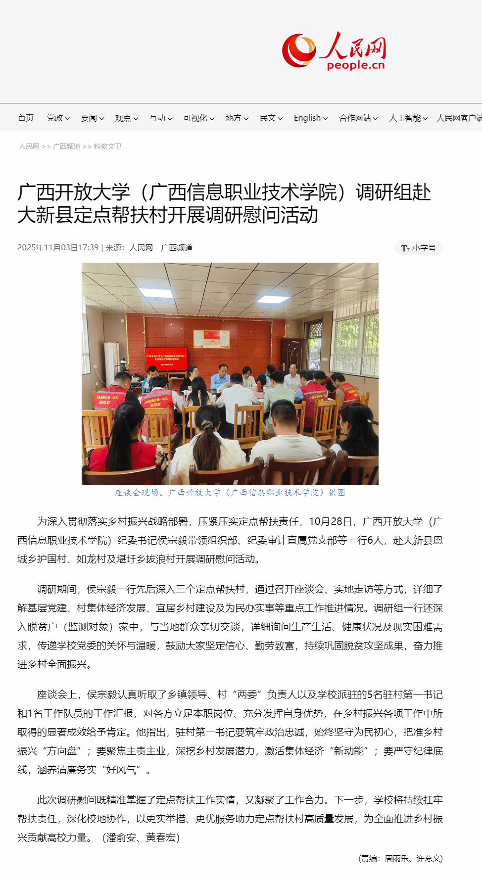 11月3日,人民网-广西频道以“星空网页版登录入口(广西信息职业技术学院)调研组赴大新县定点帮扶村开展调研慰问活动”为题,报道了为深入贯彻落实乡村振兴战略部署,压紧压实定点帮扶责任,学校纪委书记侯宗毅带领组织部、纪委审计直属党支部等一行6人,赴大新县恩城乡护国村、如龙村及堪圩乡拔浪村开展调研慰问活动的相关情况。现将报道转载如下。