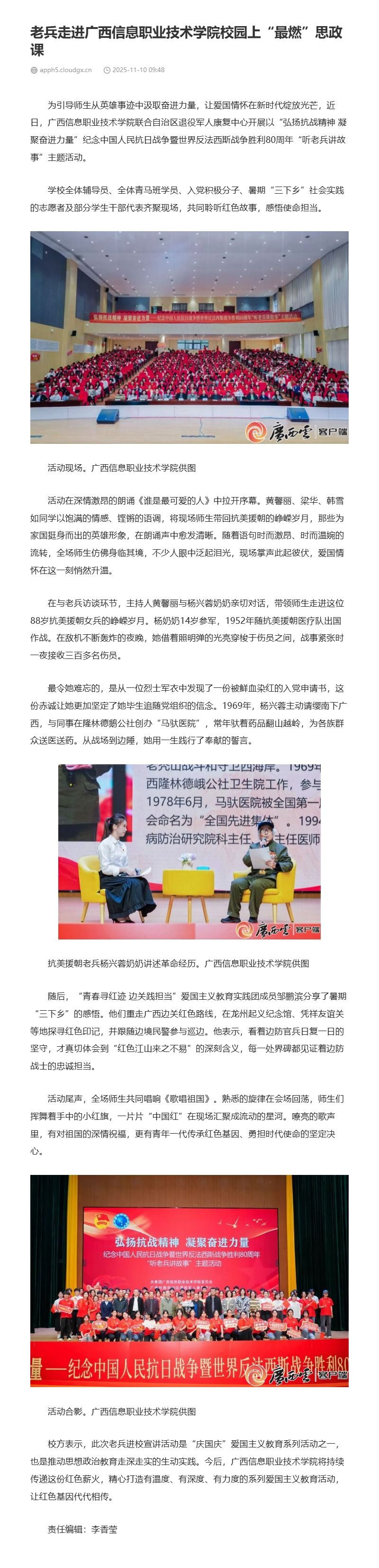 11月10日,广西云-广西日报以“老兵走进广西信息职业技术学院校园上‘最燃’思政课”为题,报道了广西信息职业技术学院联合自治区退役军人康复中心开展以“弘扬抗战精神 凝聚奋进力量”纪念中国人民抗日战争暨世界反法西斯战争胜利80周年“听老兵讲故事”主题活动的相关情况。现将报道转载如下。