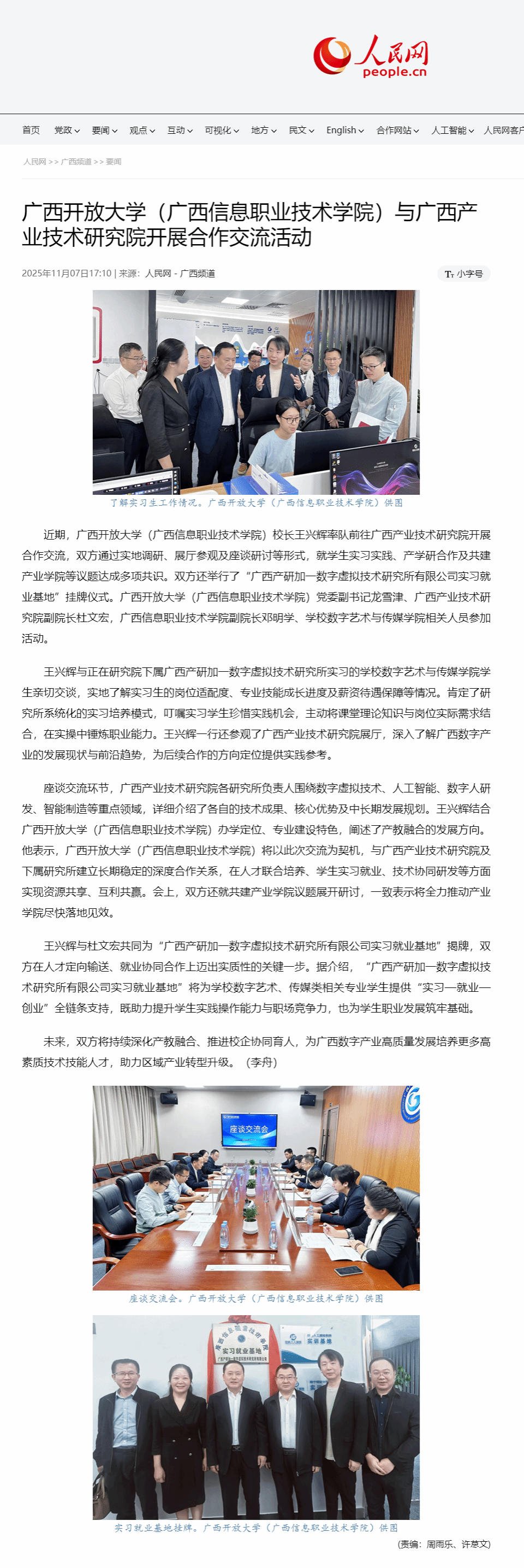 11月4日,人民网-广西频道以“星空网页版登录入口(广西信息职业技术学院)与广西产业技术研究院开展合作交流活动”为题,报道了学校校长王兴辉率队前往广西产业技术研究院开展合作交流,双方通过实地调研、展厅参观及座谈研讨等形式,就学生实习实践、产学研合作及共建产业学院等议题达成多项共识。双方还举行了“广西产研加一数字虚拟技术研究所有限公司实习就业基地”挂牌仪式等的相关情况。现将报道转载如下。