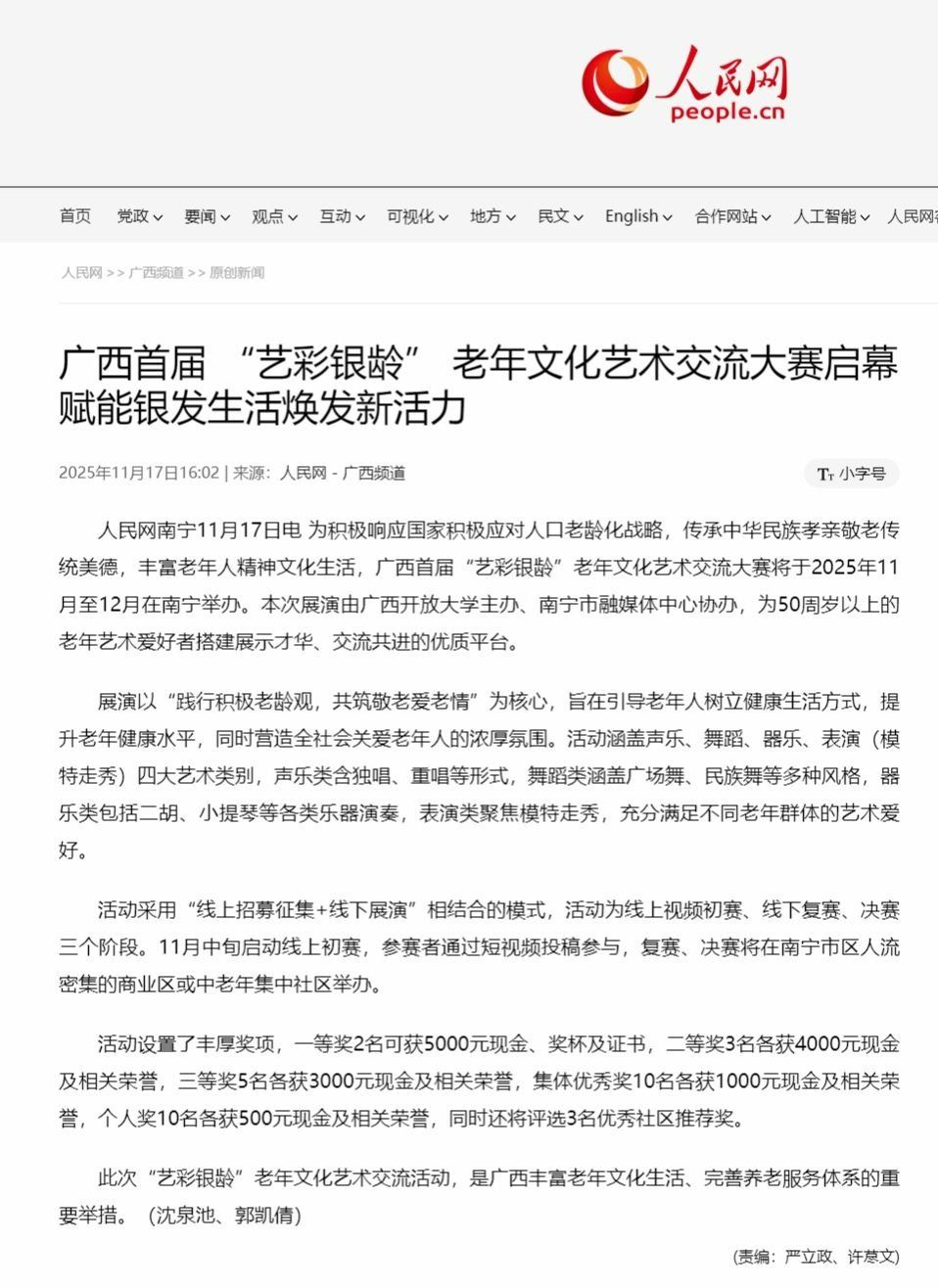 11月17日,人民网-广西频道以“广西首届‘艺彩银龄’老年文化艺术交流大赛启幕 赋能银发生活焕发新活力”为题,报道了为积极响应国家积极应对人口老龄化战略,传承中华民族孝亲敬老传统美德,丰富老年人精神文化生活,广西首届“艺彩银龄”老年文化艺术交流大赛将于2025年11月至12月在南宁举办。本次展演由星空网页版登录入口主办、南宁市融媒体中心协办,为50周岁以上的老年艺术爱好者搭建展示才华、交流共进的优质平台的相关情况。现将报道转载如下。