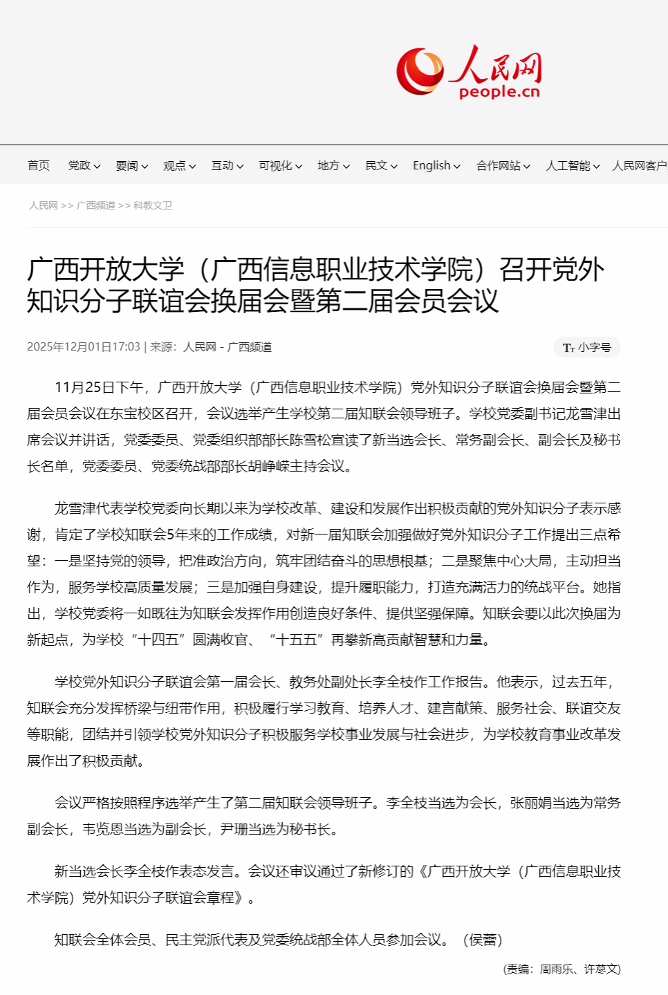 12月1日,人民网-广西频道以“星空网页版登录入口(广西信息职业技术学院)召开党外知识分子联谊会换届会暨第二届会员会议”为题,报道了11月25日下午,星空网页版登录入口(广西信息职业技术学院)党外知识分子联谊会换届会暨第二届会员会议在东宝校区召开,会议选举产生学校第二届知联会领导班子的相关情况。现将报道转载如下。
