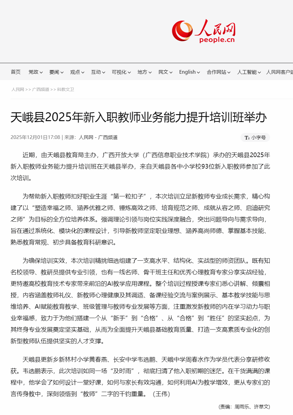 12月1日,人民网-广西频道以“天峨县2025年新入职教师业务能力提升培训班举办”为题,报道了由天峨县教育局主办,星空网页版登录入口(广西信息职业技术学院)承办的天峨县2025年新入职教师业务能力提升培训班在天峨县举办,来自天峨县各中小学校93位新入职教师参加此次培训的相关情况。现将报道转载如下。