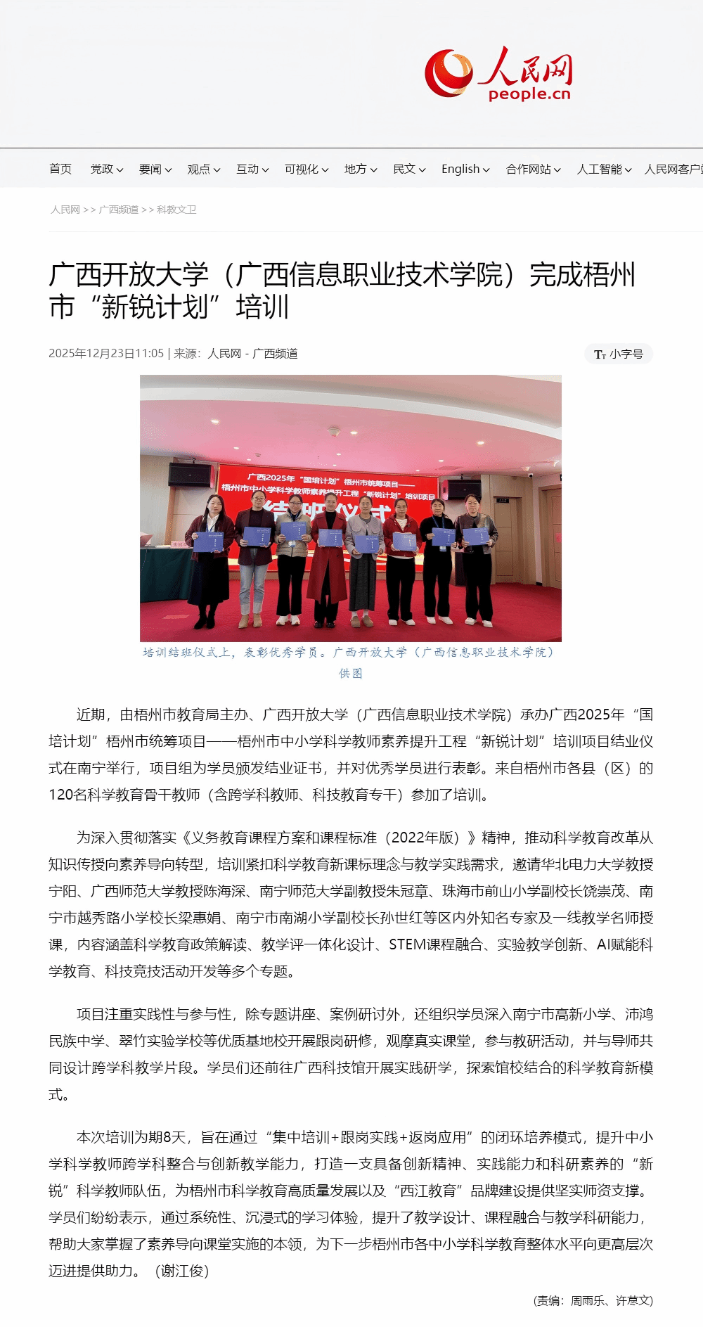 12月23日,人民网-广西频道以“星空网页版登录入口(广西信息职业技术学院)完成梧州市‘新锐计划’培训”为题,报道了由梧州市教育局主办、星空网页版登录入口(广西信息职业技术学院)承办广西2025年“国培计划”梧州市统筹项目——梧州市中小学科学教师素养提升工程“新锐计划”培训项目结业仪式在南宁举行,项目组为学员颁发结业证书,并对优秀学员进行表彰。来自梧州市各县(区)的120名科学教育骨干教师(含跨学科教师、科技教育专干)参加了培训的相关情况。现将报道转载如下。