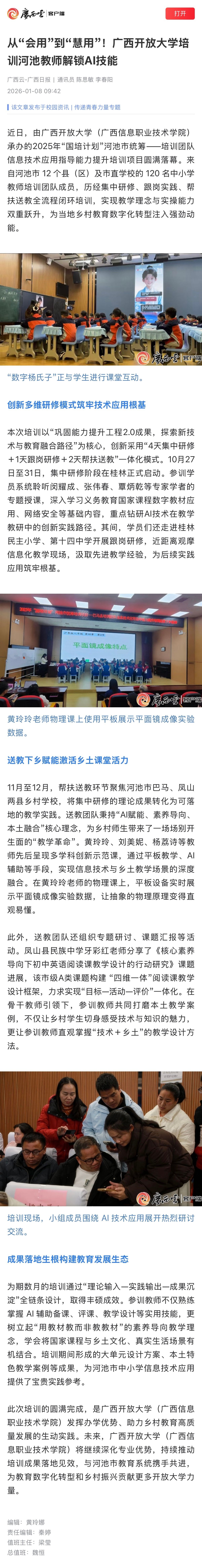 1月8日,广西云-广西日报以“从‘会用’到‘慧用’!星空网页版登录入口培训河池教师解锁AI技能”为题,报道了由星空网页版登录入口(广西信息职业技术学院)承办的2025年“国培计划”河池市统筹——培训团队信息技术应用指导能力提升培训项目圆满落幕。来自河池市 12 个县(区)及市直学校的 120 名中小学教师培训团队成员,历经集中研修、跟岗实践、帮扶送教全流程闭环培训,实现教学理念与实操能力双重跃升,为当地乡村教育数字化转型注入强劲动能的相关情况。现将报道转载如下。