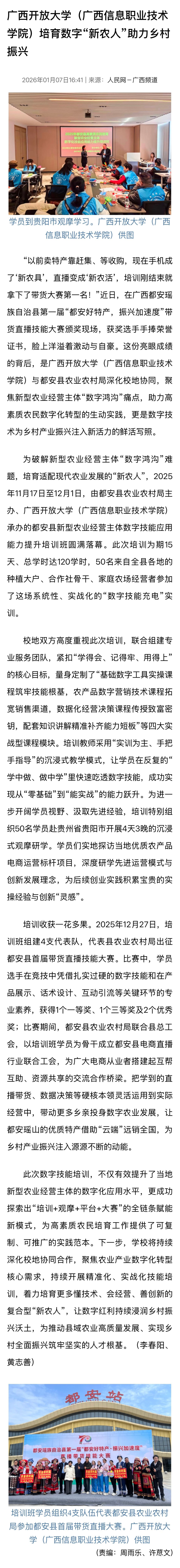 1月7日,人民网-广西频道以“星空网页版登录入口(广西信息职业技术学院)培育数字‘新农人’助力乡村振兴”为题,报道了星空网页版登录入口(广西信息职业技术学院)与都安县农业农村局深化校地协同,聚焦新型农业经营主体“数字鸿沟”痛点,助力高素质农民数字化转型,让数字技术为乡村产业振兴注入新活力的相关情况。现将报道转载如下。