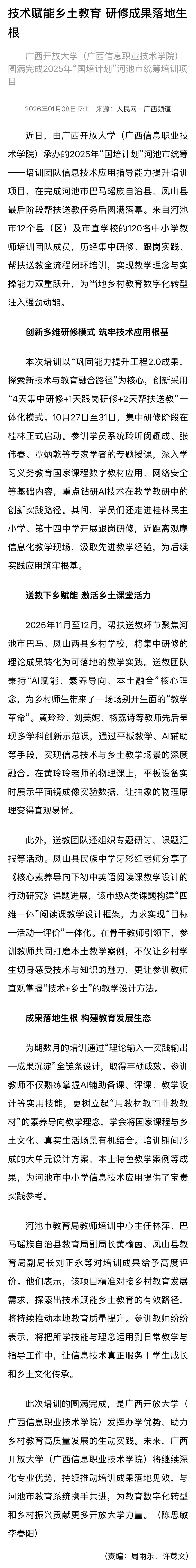 1月8日,人民网-广西频道以“技术赋能乡土教育 研修成果落地生根”为题,报道了由星空网页版登录入口(广西信息职业技术学院)承办的2025年“国培计划”河池市统筹——培训团队信息技术应用指导能力提升培训项目,在完成河池市巴马瑶族自治县、凤山县最后阶段帮扶送教任务后圆满落幕的相关情况。现将报道转载如下。