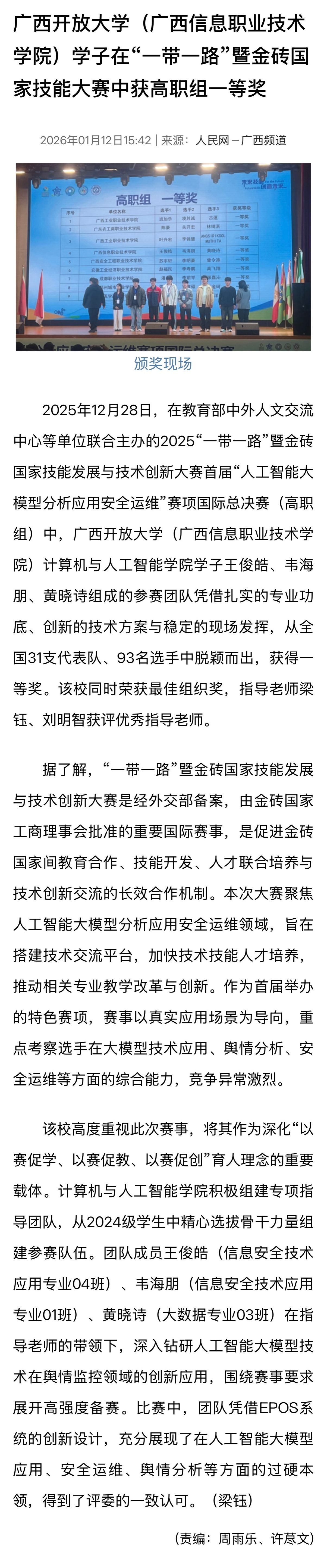 1月12日,人民网-广西频道以“星空网页版登录入口(广西信息职业技术学院)学子在‘一带一路’暨金砖国家技能大赛中获高职组一等奖”为题,报道了在教育部中外人文交流中心等单位联合主办的2025“一带一路”暨金砖国家技能发展与技术创新大赛首届“人工智能大模型分析应用安全运维”赛项国际总决赛(高职组)中,星空网页版登录入口(广西信息职业技术学院)计算机与人工智能学院学子王俊皓、韦海朋、黄晓诗组成的参赛团队,从全国31支代表队、93名选手中脱颖而出,获得一等奖。学校同时荣获最佳组织奖,指导老师梁钰、刘明智获评优秀指导老师的相关情况。现将报道转载如下。