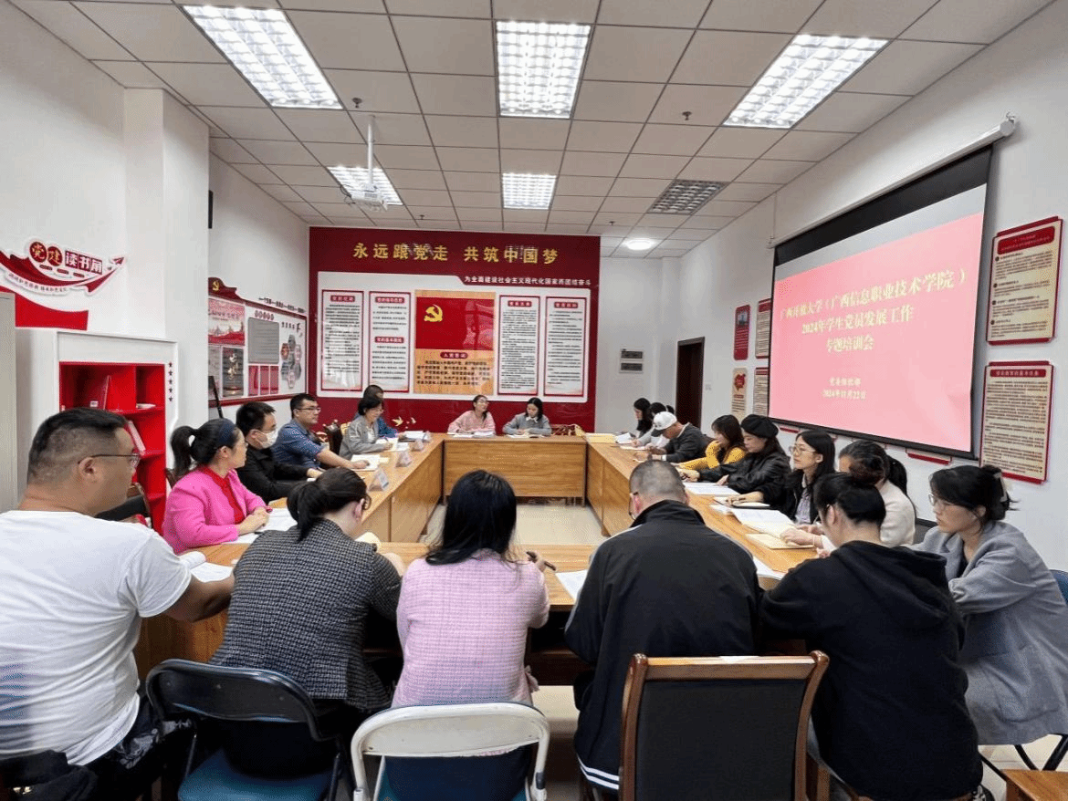 党委组织部 黄柳喜报道 为进一步规范发展党员工作流程,提升党务工作者的业务能力,11月22日下午,星空网页版登录入口在五象校区冲之楼202党建活动室举办了2024年学生党员发展工作专题培训会。各二级学院党总支书记(专职副书记)、全体专职组织员以及学生党支部书记、组织委员参加培训。培训会由党委组织部副部长何艳珍主讲。