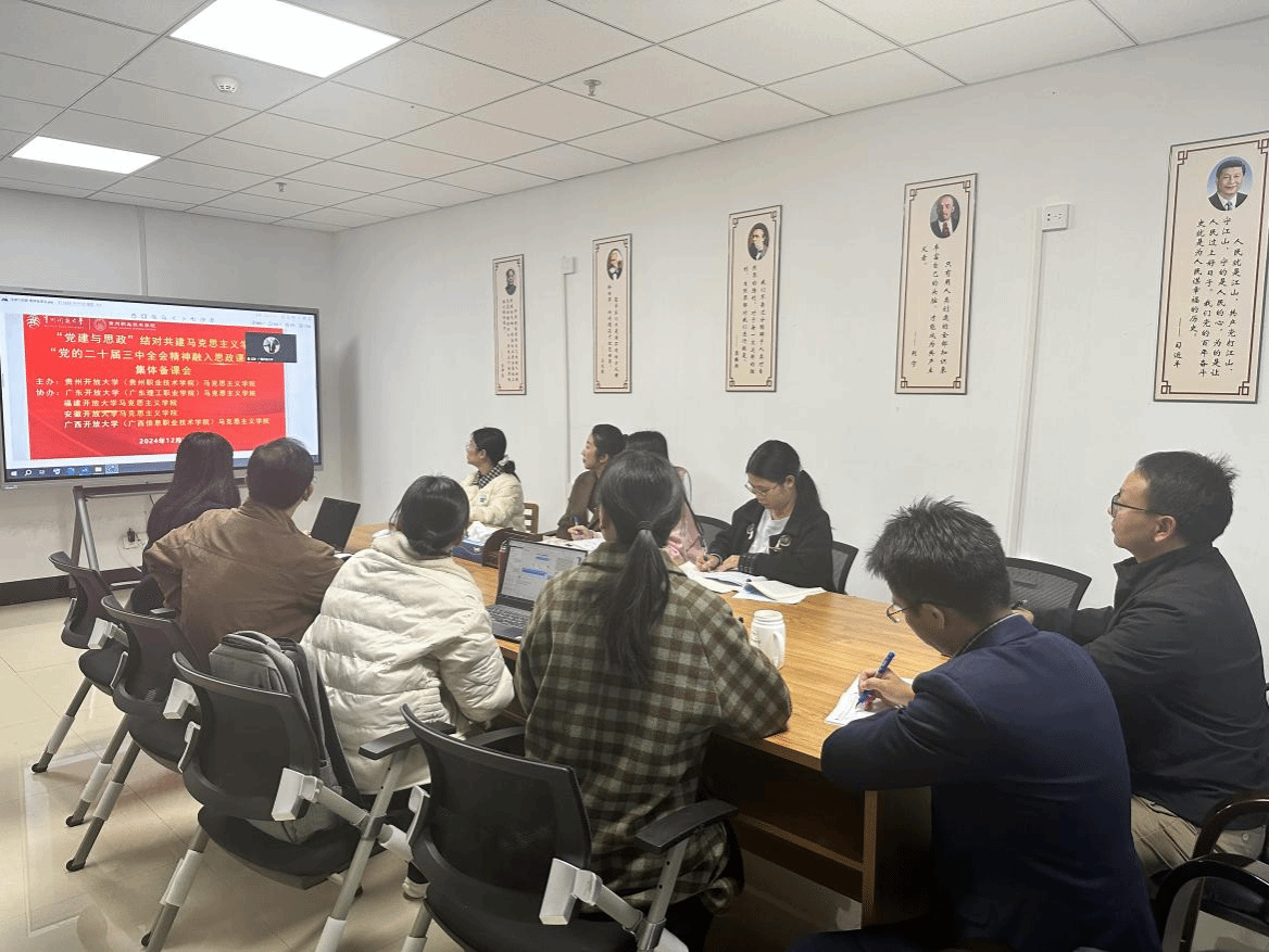 马克思主义学院 林新绣报道 12月10日,为深入学习贯彻党的二十届三中全会精神,加强思政课教学交流与合作,星空网页版登录入口马克思主义学院在行政楼508会议室通过线上方式参加了由贵州开放大学(贵州职业技术学院)马克思主义学院主办的“党建与思政”结对共建集体备课活动。