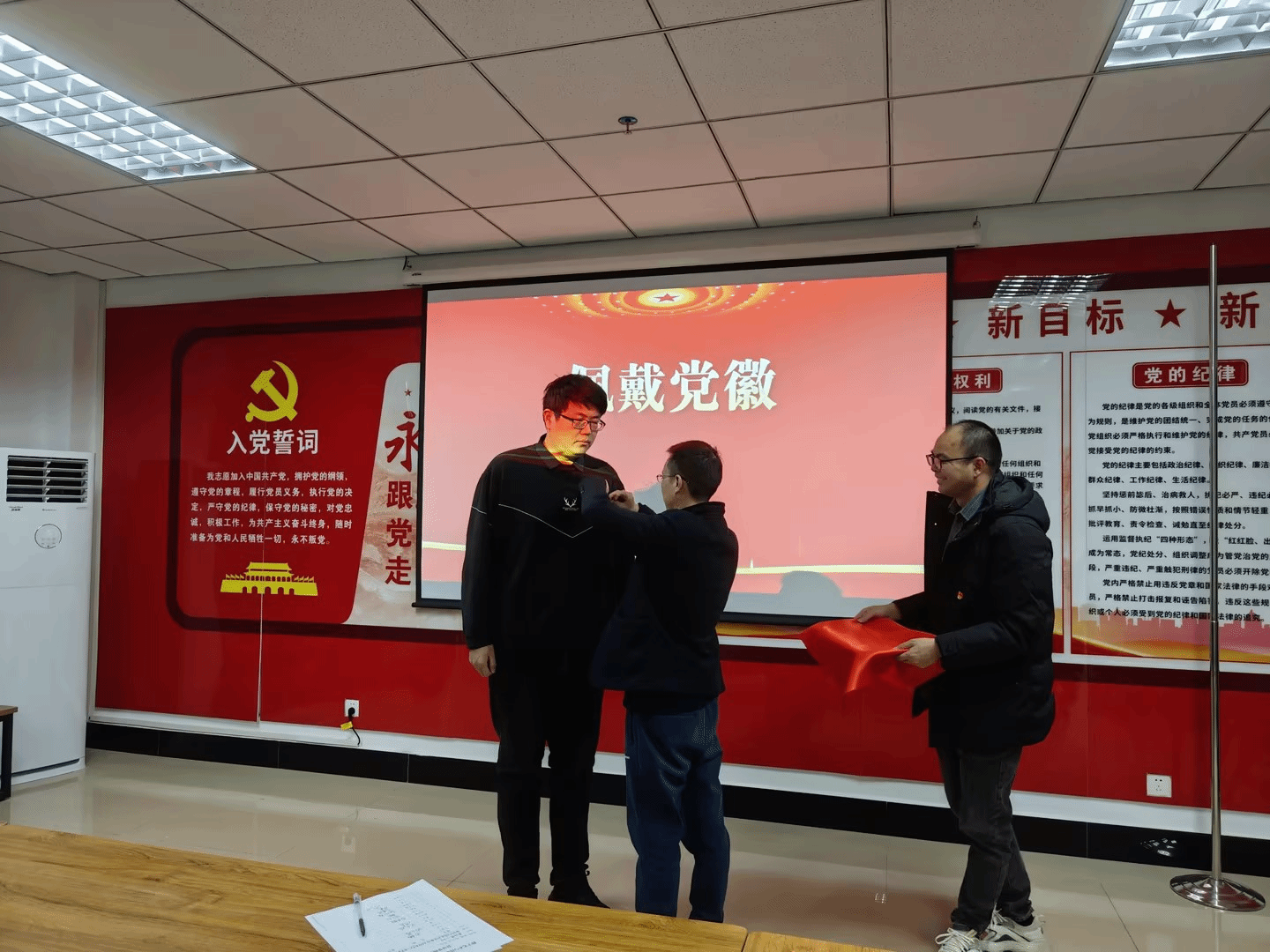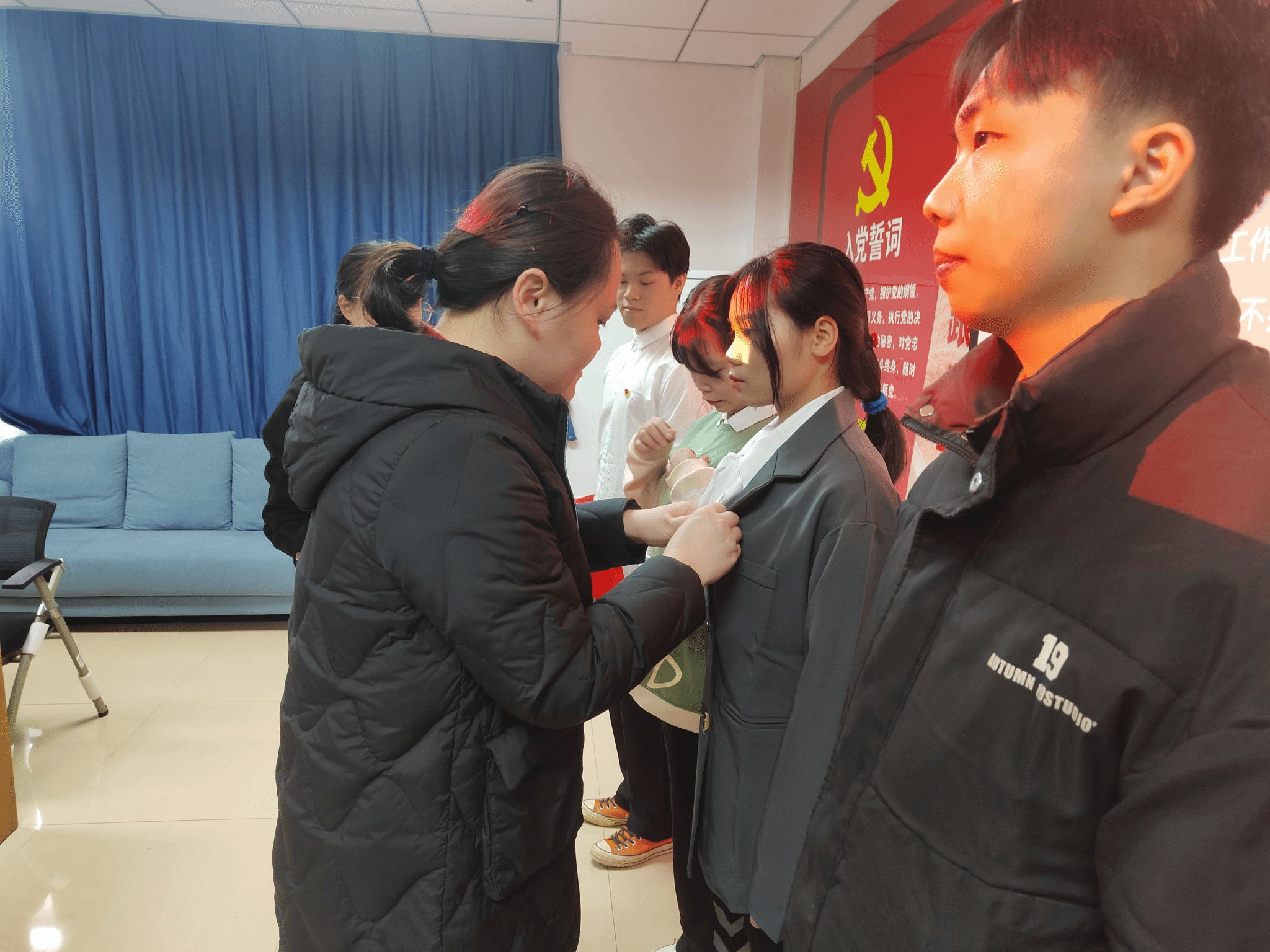 为成为预备党员的师生们佩戴党员徽章